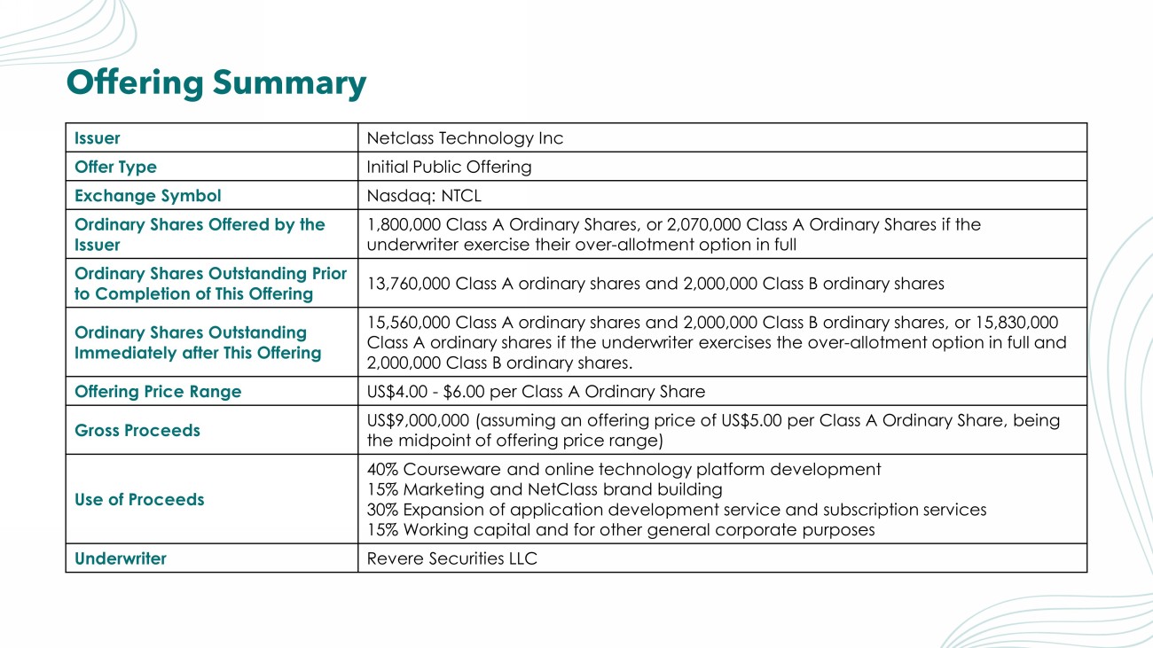 发行摘要发行人Netclass Technology Inc发售类型首次公开发行股票交易所代码纳斯达克:发行人发售的NTCL普通股1,800,000股A类普通股,或2,070,000股A类普通股,前提是承销商在本次发行完成前全额行使已发行普通股超额配股权,以发行13,760,000股A类普通股和2,000,000股紧随本次发行后已发行的B类普通股15,560,000股A类普通股和2,000,000股B类普通股,或15,830,000股A类普通股(如承销商全额行使超额配股权)和2,000,000股B类普通股。发行价格区间每股A类普通股4.00-6.00美元总收益9,000,000美元(假设发行价格为每股A类普通股5.00美元,为发行价格区间的中点)使用收益40%课件和在线技术平台开发15%营销和NetClass品牌建设30%扩展应用程序开发服务和订阅服务15%营运资金和其他一般公司用途承销商Revere Securities LLC