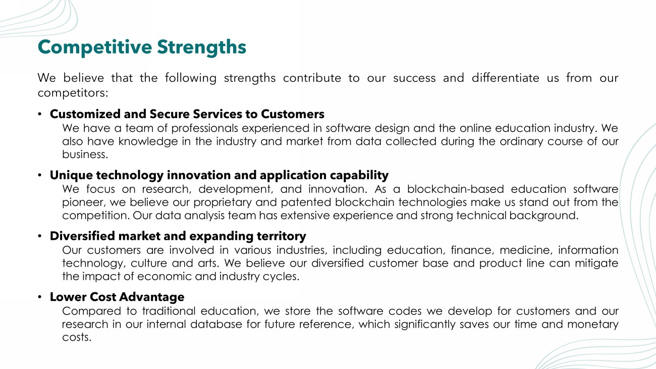 竞争优势我们认为,以下优势有助于我们取得成功,并使我们有别于竞争对手:•为客户提供定制化和安全的服务我们拥有一支在软件设计和在线教育行业经验丰富的专业团队。我们还从日常业务过程中收集的数据中获得了行业和市场方面的知识。•独特的技术创新和应用能力我们专注于研究、开发、创新。作为一家基于区块链的教育软件先驱,我们相信我们的专有和专利区块链技术使我们在竞争中脱颖而出。我们的数据分析团队拥有丰富的经验和强大的技术背景。•市场多元化,版图不断扩大我们的客户涉及多个行业,包括教育、金融、医药、信息技术、文化艺术等。我们相信,我们多元化的客户群和产品线可以减轻经济和行业周期的影响。•与传统教育相比,成本优势更低,我们将为客户开发的软件代码和我们的研究存储在我们的内部数据库中以供将来参考,这大大节省了我们的时间和金钱成本。