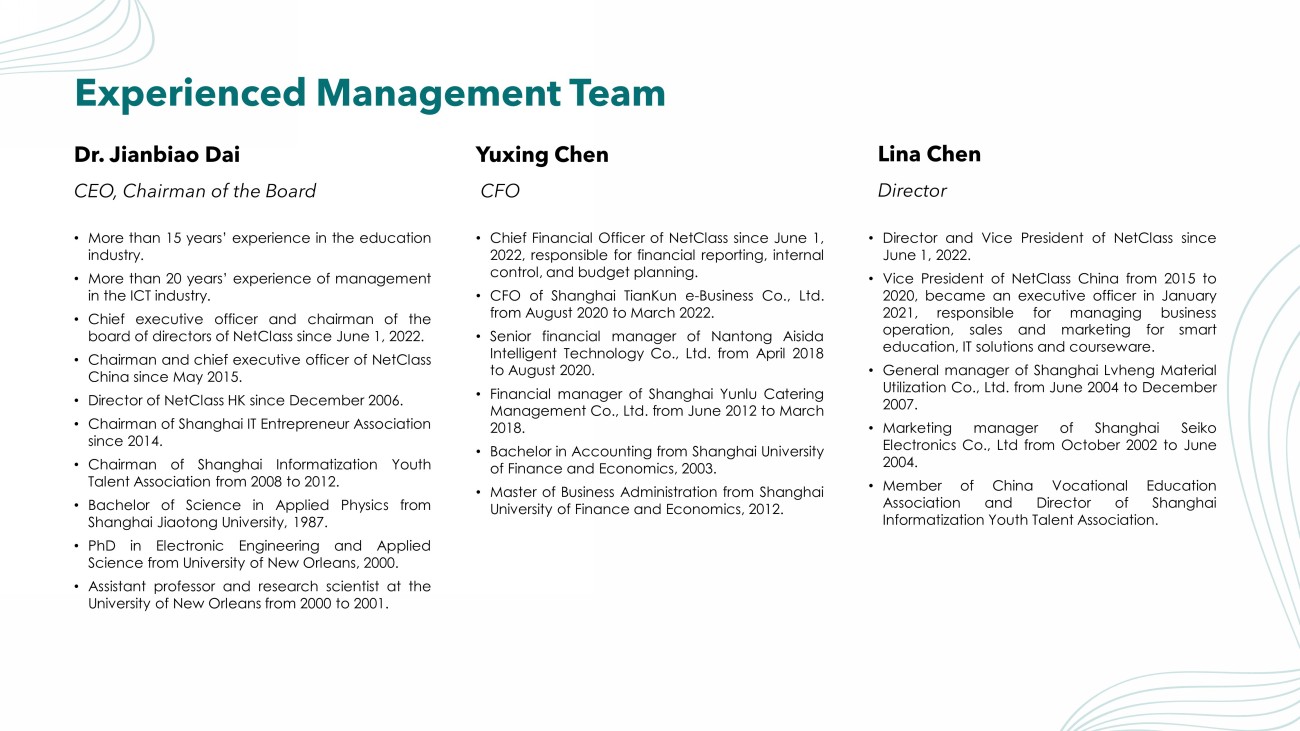 经验丰富的管理团队戴建彪博士CEO、董事长陈宇星CFO陈丽娜董事• 15年以上教育行业从业经验。• 20年以上ICT行业管理经验。•自2022年6月1日起任NetClass首席执行官兼董事会主席。• 2015年5月至今任网课中国董事长兼首席执行官。• 2006年12月起任NetClass HK董事。• 2014年至今任上海市IT企业家协会会长。• 2008年至2012年上海市信息化青年人才协会会长。•上海交通大学应用物理学理学学士,1987年。• 2000年获得新奥尔良大学电子工程和应用科学博士学位。• 2000年至2001年在新奥尔良大学担任助理教授和研究科学家。• 2022年6月1日起任NetClass董事、副总裁。• 2015年至2020年任网课中国副总裁,2021年1月成为执行官,负责管理智慧教育、IT解决方案和课件的业务运营、销售和营销。• 2004年6月至2007年12月任上海绿恒材料利用有限公司总经理。• 2002年10月至2004年6月任上海精工电子有限公司营销经理。•中国职业教育协会会员、上海市信息化青年人才协会理事。• NetClass自2022年6月1日起担任首席财务官,负责财务报告、内部控制、预算规划等工作。• 2020年8月至2022年3月任上海天坤e商务有限公司CFO。• 2018年4月-2020年8月南通爱司达智能科技有限公司高级财务经理。• 2012年6月-2018年3月上海云旅餐饮管理有限公司财务经理。•上海财经大学会计学学士,2003年。•上海财经大学工商管理硕士,2012年。