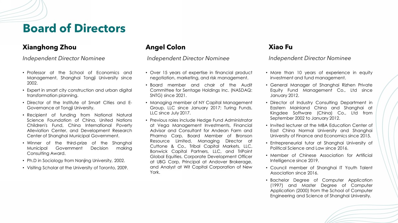 董事会周向红独立董事提名人Angel Colon独立董事提名人Xiao Fu独立董事提名人• 2002年至今任上海同济大学经济管理学院教授。•智慧城市建设与城市数字化转型规划专家。•同济大学智慧城市与E-Governance研究所所长。•国家自然科学基金、联合国儿童基金会、中国国际扶贫中心、上海市政府发展研究中心资助获得者。•上海市政府决策咨询奖三等奖获得者。•南京大学社会学博士,2002年。•多伦多大学访问学者,2009年。• 10年以上股权投资、基金管理经验。• 2012年1月至今任上海日振私募基金管理有限公司总经理。• 2002年9月至2012年1月在金蝶软件(中国)有限公司任中国东部及上海行业咨询部总监。• 2015年至今华东师范大学、上海财经大学MBA教育中心特邀讲师。• 2016年至今上海政法大学创业导师。• 2019年至今中国人工智能协会会员。• 2016年至今上海市IT青年人才协会理事。•上海大学计算机工程与科学学院计算机应用学士学位(1997年)、计算机应用硕士学位(2000年)。•在金融产品谈判、市场营销和风险管理方面拥有超过15年的专业知识。•自2021年起担任叁腾控股公司(纳斯达克股票代码:SNTG)的董事会成员和审计委员会主席。•自2017年1月起担任NY Capital Management Group,LLC管理成员;自2017年7月起担任Turing Funds,LLC。•此前担任的职务包括Vega Management Investments的对冲基金管理员、Andean Farm and Pharma Corp的财务顾问和顾问、Bronson Resource Limited的董事会成员、Cuttone & Co.、Tribal Capital Markets,LLC、Bonwick Capital Partners,LLC和TriPoint Global Equities的董事总经理、UBG Corp的企业发展官、Andover Brokerage的负责人以及纽约Wit Capital Corporation的分析师。