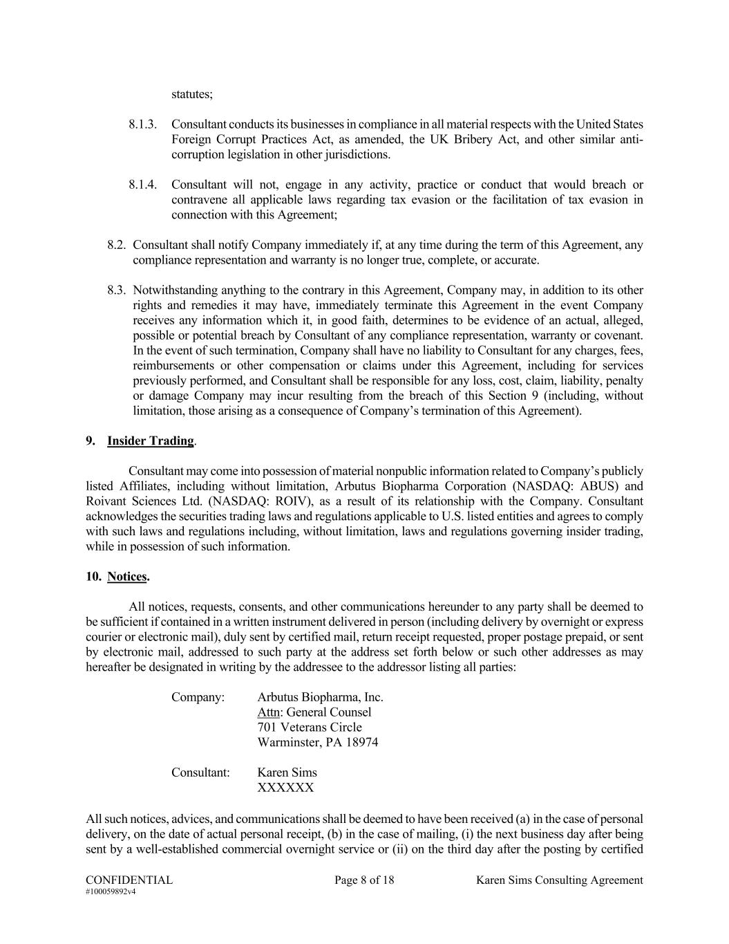 机密第8页,共18页Karen Sims咨询协议# 100059892v4法规;8.1.3。Consultant开展业务的所有重大方面均符合经修订的美国《反海外腐败法》、《英国反贿赂法》以及其他司法管辖区的其他类似反腐败立法。8.1.4.顾问公司将不会从事任何活动、实践或行为,这些活动、实践或行为将违反或违反与本协议有关的逃税或便利逃税的所有适用法律;8.2。如在本协议期限内的任何时间,任何合规陈述和保证不再真实、完整、准确,顾问应立即通知公司。8.3.尽管本协议中有任何相反的规定,如果公司收到其善意确定为顾问实际、指称、可能或可能违反任何合规陈述、保证或契约的证据的任何信息,除其可能拥有的其他权利和补救措施外,公司可立即终止本协议。在发生此种终止的情况下,公司对本协议项下的任何费用、费用、补偿或其他赔偿或索赔,包括先前提供的服务,均不向顾问公司承担任何责任,并且顾问公司应对公司因违反本第9条(包括但不限于因公司终止本协议而产生的损失、成本、索赔、责任、罚款或损害)而可能招致的任何损失、成本、赔偿责任、罚款或损害负责。9.内幕交易。由于与公司的关系,Consultant可能会拥有与公司公开上市的关联公司相关的重大非公开信息,包括但不限于Arbutus Biopharma Corporation(NASDAQ:ABUS)和Roivant Sciences Ltd.(NASDAQ:ROIV)。Consultant承认适用于美国上市实体的证券交易法律法规,并同意在拥有此类信息的情况下遵守此类法律法规,包括但不限于有关内幕交易的法律法规。10.通知。根据本协议向任何一方发出的所有通知、请求、同意书和其他通信,如包含在亲自交付(包括以隔夜或快递或电子邮件交付)、以挂号信、要求的回执、预付适当邮资或以电子邮件方式发送的书面文书中、按下述地址或收件人以后可能以书面指定的其他地址发送给列出所有各方的收件人,则应视为已足够:公司:Arbutus生物制药,Inc. Attn:总法律顾问701 Veterans Circle Warminster,PA 18974咨询人:Karen Sims XXXXXX所有这些通知、通知和通信应被视为已收到(a)在亲自交付的情况下,在实际亲自收到的日期,(b)在邮寄的情况下,(i)在通过完善的商业隔夜服务发送后的下一个工作日或(ii)在通过认证的邮寄后的第三天