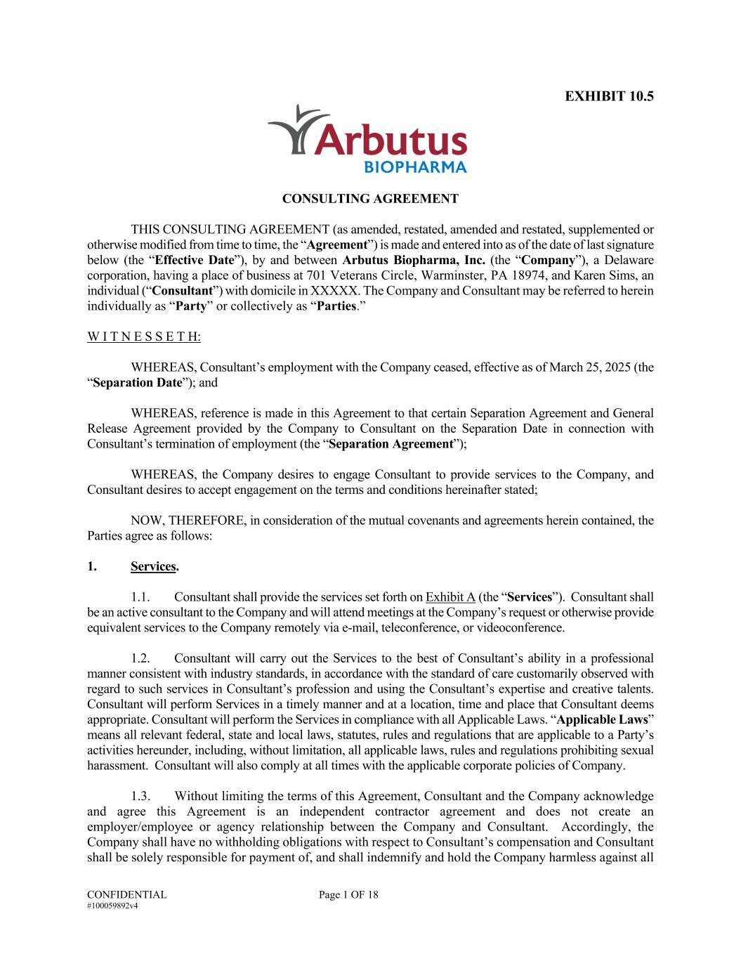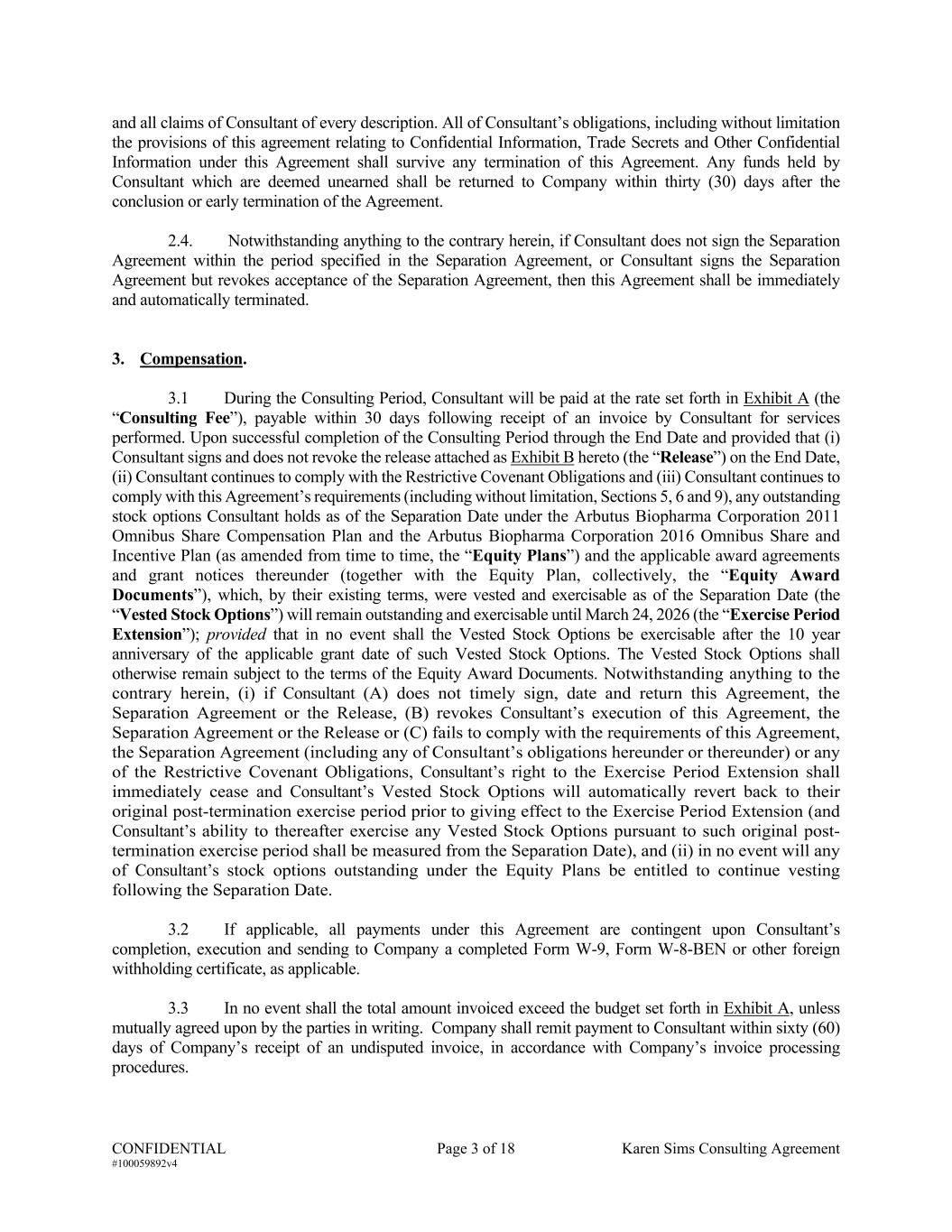 机密第3页,共18页Karen Sims咨询协议# 100059892v4和所有描述的顾问的所有索赔。顾问公司的所有义务,包括但不限于本协议中有关本协议项下的机密信息、商业秘密和其他机密信息的规定,在本协议的任何终止后仍然有效。Consultant持有的任何被视为未赚取的资金应在协议订立或提前终止后三十(30)天内退还公司。2.4.尽管有任何与此相反的情况,如果顾问公司未在离职协议规定的期限内签署离职协议,或顾问公司签署离职协议但撤销对离职协议的接受,则本协议应立即自动终止。3.赔偿。3.1在咨询期内,Consultant将按照附件 A中规定的费率(“咨询费”)获得报酬,在Consultant收到所提供服务的发票后30天内支付。成功完成至结束日期的咨询期后,并订明(i)顾问于结束日期签署且不撤销作为本协议所附的附件 B的发布(“发布”),(ii)顾问继续遵守限制性契约义务及(iii)顾问继续遵守本协议的规定(包括但不限于第5、6及9节),根据Arbutus Biopharma Corporation 2011年综合股份补偿计划和Arbutus Biopharma Corporation 2016年综合股份和激励计划(经不时修订,“股权计划”)以及根据其现有条款在分立日期归属和可行使的股权计划(连同股权计划,统称为“股权奖励文件”)下,顾问截至分立日期持有的任何未行使股票期权将在3月24日之前仍未行使且可行使,2026年(“行权期延期”);但在任何情况下,已归属股票期权均不得在该等已归属股票期权的适用授予日10周年之后行权。否则,归属股票期权仍受股权奖励文件条款的约束。尽管有任何与此相反的规定,(i)如果顾问(a)没有及时签署、注明日期和交还本协议、离职协议或解除,(b)撤销顾问执行本协议、离职协议或解除,或(c)没有遵守本协议、离职协议(包括顾问根据本协议或根据本协议承担的任何义务)或任何限制性公约义务的要求,顾问的行权期延长权利应立即终止,顾问的既得股票期权将自动恢复到其在行权期延长生效之前的原终止后行权期(并且顾问此后根据该原终止后行权期行使任何既得股票期权的能力应从分立日期开始衡量),并且(ii)在任何情况下,顾问在股权计划下未行使的任何股票期权均无权在分立日期之后继续归属。3.2如适用,本协议项下的所有付款取决于顾问完成、执行并向公司发送填妥的W-9表格、W-8-BEN表格或其他外国扣缴凭证(如适用)。3.3在任何情况下,开具发票的总金额均不得超过附件 A所列预算,除非双方以书面形式相互约定。公司应在公司收到无争议发票后六十(60)天内,按照公司的发票处理程序,将款项汇给顾问公司。