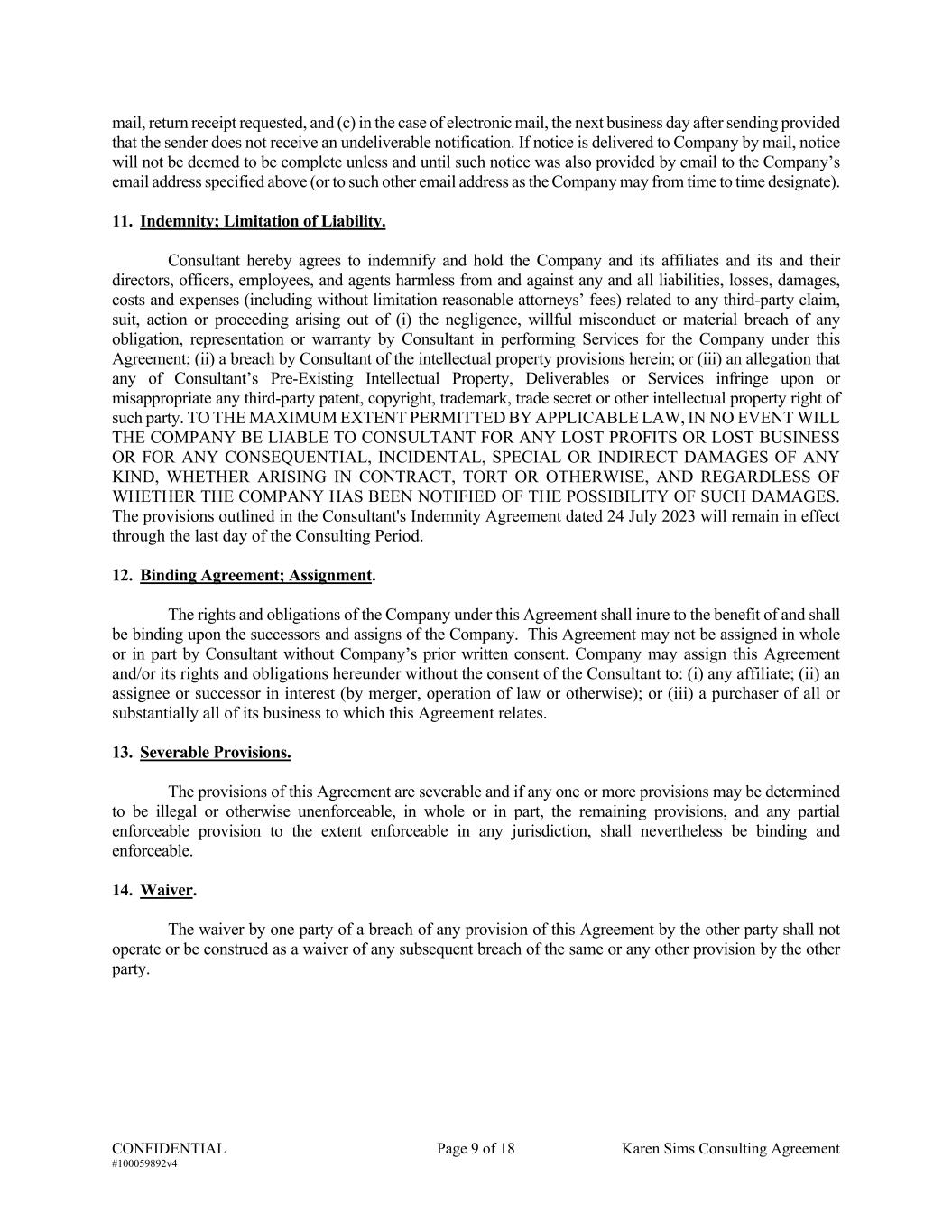 机密第9页,共18页Karen Sims咨询协议# 100059892v4邮件,要求回执,以及(c)在电子邮件的情况下,发送后的下一个工作日,前提是发件人没有收到无法投递的通知。如通知以邮寄方式送达公司,则通知将不会被视为完整,除非且直至该通知亦以电子邮件方式提供至公司上述指明的电子邮件地址(或公司不时指定的其他电子邮件地址)。11.赔偿;责任限制。顾问特此同意就因(i)疏忽、故意不当行为或重大违反任何义务而引起的与任何第三方索赔、诉讼、诉讼或程序有关的任何和所有责任、损失、损害、成本和费用(包括但不限于合理的律师费),对公司及其关联公司及其董事、高级职员、雇员和代理人进行赔偿并使其免受损害,Consultant在根据本协议为公司提供服务时作出的陈述或保证;(ii)Consultant违反本协议中的知识产权条款;或(iii)指称顾问的任何先前存在的知识产权、可交付成果或服务侵犯或盗用该方的任何第三方专利、版权、商标、商业秘密或其他知识产权。在适用法律允许的最大限度内,公司在任何情况下都不会对任何利润损失或业务损失或任何形式的后果性、偶发性、特殊或间接损害承担咨询责任,无论其产生于合同、侵权或其他方面,无论是否已通知公司此类损害的可能性。日期为2023年7月24日的顾问赔偿协议中概述的条款将在咨询期的最后一天继续有效。12.具有约束力的协议;转让。公司在本协议项下的权利和义务对公司的继承人和受让人有利,并对其具有约束力。未经公司事先书面同意,本协议不得由顾问公司全部或部分转让。公司可将本协议和/或其在本协议下的权利和义务转让给:(i)任何关联公司;(ii)利益上的受让人或继承人(通过合并、法律运作或其他方式);或(iii)本协议所涉及的其全部或基本全部业务的购买者。13.可分割条款。本协议的条款是可分割的,如果任何一项或多项条款可能被确定为非法或以其他方式不可执行,则全部或部分,其余条款以及任何部分可执行的条款在任何司法管辖区可执行的范围内,仍应具有约束力和可执行性。14.放弃。一方对另一方违反本协议任何条款的放弃不应起作用或被解释为对另一方随后违反同一或任何其他条款的放弃。