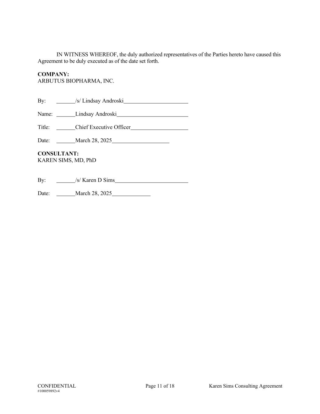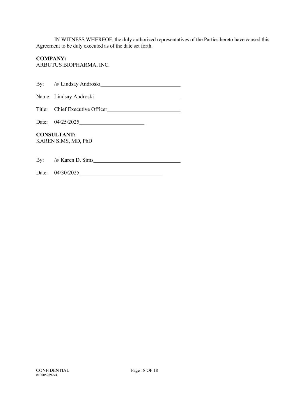 保密第18页# 100059892v4作为证人,本协议双方的正式授权代表已安排在规定日期正式签署本协议。公司:ARBUTUS BIOPHARMA,INC。作者:/s/Lindsay Androski姓名:Lindsay Androski职务:首席执行官日期:04/25/2025顾问:KAREN SIMS,医学博士,博士作者:/s/Karen D. SIMS日期:04/30/2025
