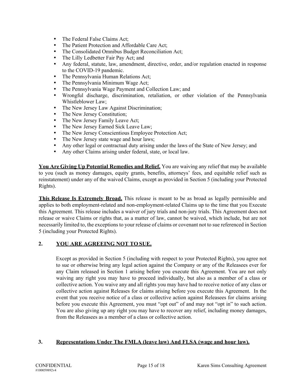 机密第15页,共18页Karen Sims咨询协议# 100059892v4联邦虚假索赔法案;患者保护和平价医疗法案;综合综合预算和解法案;Lilly Ledbetter公平薪酬法案;以及为应对新冠肺炎大流行而颁布的任何联邦、法规、法律、修正案、指令、命令和/或法规。《宾夕法尼亚州人际关系法案》;《宾夕法尼亚州最低工资法》;《宾夕法尼亚州工资支付和征收法》;以及不当解雇、歧视、报复,或其他违反《宾夕法尼亚州告密者法》;《新泽西州反歧视法》;《新泽西州宪法》;《新泽西州探亲假法案》;《新泽西州赚取病假法》;《新泽西州良心雇员保护法》;《新泽西州工资和工时法》;根据新泽西州法律产生的任何其他法律或合同义务;以及根据联邦、州或地方法律产生的任何其他索赔。你正在放弃潜在的补救和救济。您正在放弃根据任何被放弃的索赔可能向您提供的任何救济(例如金钱损害赔偿、股权授予、福利、律师费和公平救济,例如恢复原状),但第5节规定的除外(包括您受保护的权利)。这次发布极为广泛。本新闻稿旨在在法律允许的范围内尽可能广泛,并在您执行本协议之前适用于与就业相关和与非就业相关的索赔。此次发布包括放弃陪审团审判和非陪审团审判。本协议不解除或放弃作为法律事项不能放弃的索赔或权利,其中包括但不一定限于第5节中提及的您解除索赔或不起诉的约定的例外情况(包括您受保护的权利)。2.你们同意不起诉。除第5条规定(包括与您受保护的权利有关)外,您同意不就在您执行本协议之前产生的第1条中解除的任何索赔对公司或任何被释放者提起诉讼或以其他方式提起任何法律诉讼。您不仅放弃了您可能必须单独进行的任何权利,而且还作为集体或集体诉讼的成员。在您执行本协议之前,您将放弃您可能已经收到针对Releases的索赔的任何集体或集体诉讼通知的任何和所有权利。如果在您执行本协议之前收到针对Releasees的索赔的集体或集体诉讼通知,您必须“选择退出”并且不得“选择加入”此类诉讼。你还放弃了作为集体或集体诉讼成员从被释放者那里获得任何救济,包括金钱损失的任何权利。3.根据FMLA(休假法)和FLSA(工资和工时法)进行代理。
