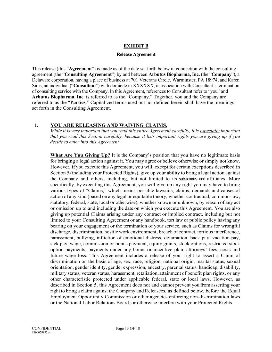 机密page 13 of 18 # 100059892v4 ExXHIBIT B发布协议本次发布(本“协议”)是在下述日期就营业地点为701 Veterans Circle,Warminster,PA 18974的特拉华州公司Arbutus生物制药,Inc.(“公司”)与住所为XXXXXX的个人(“顾问”)Karen Sims之间的咨询协议(“咨询协议”)作出的,与Consultant终止与公司的咨询服务有关。在这份协议中,对Consultant的提及是指“您”,而Arbutus生物制药,Inc.则是指“公司”。你们和公司合称为“当事人”。此处使用但未定义的大写术语应具有咨询协议中规定的含义。1.您正在释放并放弃索赔。虽然仔细阅读整个协议非常重要,但仔细阅读这一部分尤其重要,因为它列出了如果您决定签订本协议,您将放弃的重要权利。你在放弃什么?公司的立场是,你对它提起法律诉讼没有正当的依据。你可能同意或相信不是,或者根本不知道。然而,如果您执行本协议,除第5节中描述的某些例外情况(包括您的受保护权利)外,您将放弃您对公司和其他人(包括但不限于其子公司和关联公司)提起法律诉讼的能力。更具体地说,通过执行本协议,您将放弃您可能拥有的任何权利,以提出各种类型的“索赔”,这意味着可能的诉讼、索赔、要求和任何类型的诉讼(基于任何法律或衡平法理论,无论是合同、普通法、法定、联邦、州、地方或其他方面),无论已知或未知,由于任何作为或不作为,直至并包括您执行本协议之日。您还将放弃根据任何合同或默示合同产生的潜在索赔,包括但不限于您的咨询协议或任何与您的聘用或终止服务有关的手册、侵权法或公共政策,例如对不当解雇、歧视、敌对工作环境、违约、侵权干扰、骚扰、欺凌、造成情绪困扰、诽谤、欠薪、假期工资、病假工资、工资、佣金或奖金支付、股权授予、股票期权、限制性股票期权支付、任何奖金或激励计划下的支付、律师费、成本和未来工资损失的索赔。本协议包括解除您主张基于年龄、性别、种族、宗教、国籍、婚姻状况、性取向、性别认同、性别表达、血统、父母身份、残疾、残疾、军人身份、退伍军人身份、骚扰、报复、实现福利计划权利或适用的联邦、州或地方法律保护的任何其他特征的歧视主张的权利。然而,如第5节所述,本协议不会也不能阻止您在平等就业机会委员会或其他执行非歧视法律的机构或国家劳动关系委员会面前主张您对公司和被释放人员提出索赔的权利,如下文所定义,或以其他方式干预您的受保护权利。