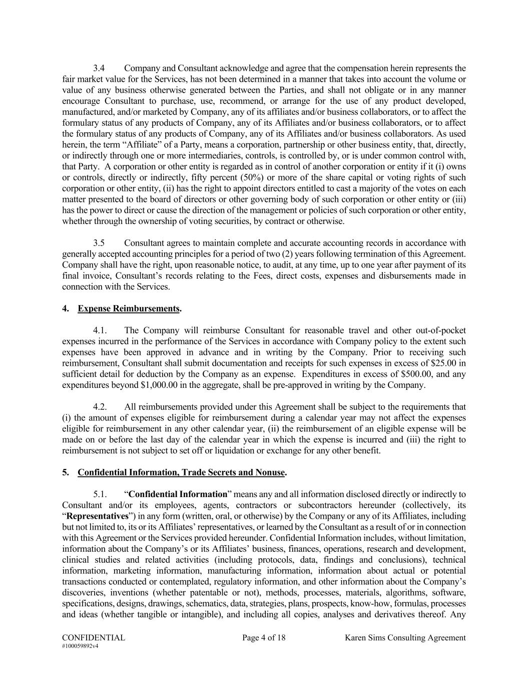 机密第4页,共18页Karen Sims Consulting Agreement # 100059892v4 3.4公司和Consultant承认并同意,此处的补偿代表服务的公平市场价值,并未以考虑到双方之间以其他方式产生的任何业务的数量或价值的方式确定,并且不应强制或以任何方式鼓励Consultant购买、使用、推荐或安排使用公司、其任何关联公司和/或业务合作者开发、制造和/或营销的任何产品,或影响公司任何产品的处方状态,其任何关联公司和/或业务合作者,或影响公司、其任何关联公司和/或业务合作者的任何产品的处方集状态。如本文所用,一方的“关联方”一词,是指通过一个或多个中介机构直接或间接控制、受该方控制或与该方共同控制的公司、合伙企业或其他经营实体。一家公司或其他实体被视为控制另一家公司或实体,如果它(i)直接或间接拥有或控制该公司或其他实体的百分之五十(50%)或以上的股本或投票权,(ii)有权任命有权就提交给该公司或其他实体的董事会或其他理事机构的每一事项投过半数票的董事,或(iii)有权指导或促使该公司或其他实体的管理层或政策的方向,无论是通过投票证券的所有权,还是通过合同或其他方式。3.5顾问同意在本协议终止后的两(2)年内按照公认会计原则保持完整和准确的会计记录。公司有权在合理通知下,在支付其最终发票后一年内的任何时间,审计顾问关于与服务有关的费用、直接成本、费用和支出的记录。4.费用报销。4.1.公司将根据公司政策向Consultant补偿在履行服务过程中产生的合理差旅和其他自付费用,但前提是这些费用已获得公司事先和书面批准。在收到此类报销之前,Consultant应提交超过25.00美元的此类费用的足够详细的文件和收据,供公司作为费用扣除。超过500.00美元的支出,以及总额超过1000.00美元的任何支出,应由公司以书面预先批准。4.2.根据本协议提供的所有偿还应遵守以下要求:(i)在一个日历年内有资格获得偿还的费用数额不得影响在任何其他日历年内有资格获得偿还的费用,(ii)将在发生费用的日历年度的最后一天或之前偿还合格费用,以及(iii)获得偿还的权利不受抵销或清算或交换任何其他利益的限制。5.机密信息、商业秘密和不使用。5.1.“机密信息”是指公司或其任何关联公司(包括但不限于其或其关联公司的代表)以任何形式(书面、口头或其他方式)直接或间接向顾问公司和/或其雇员、代理人、承包商或分包商(统称为其“代表”)披露的任何和所有信息,或由顾问因本协议或本协议项下提供的服务或与之相关而获悉的任何和所有信息。机密信息包括但不限于有关公司或其关联公司的业务、财务、运营、研发、临床研究和相关活动的信息(包括协议、数据、研究结果和结论)、技术信息、营销信息、制造信息、有关已进行或拟进行的实际或潜在交易的信息、监管信息,以及有关公司的发现、发明(无论是否可申请专利)、方法、工艺、材料、算法、软件、规格、设计、设计、图纸、示意图、数据、战略、计划、前景、专有技术、公式、过程和想法(无论有形或无形)的信息,包括其所有副本、分析和衍生工具。任何