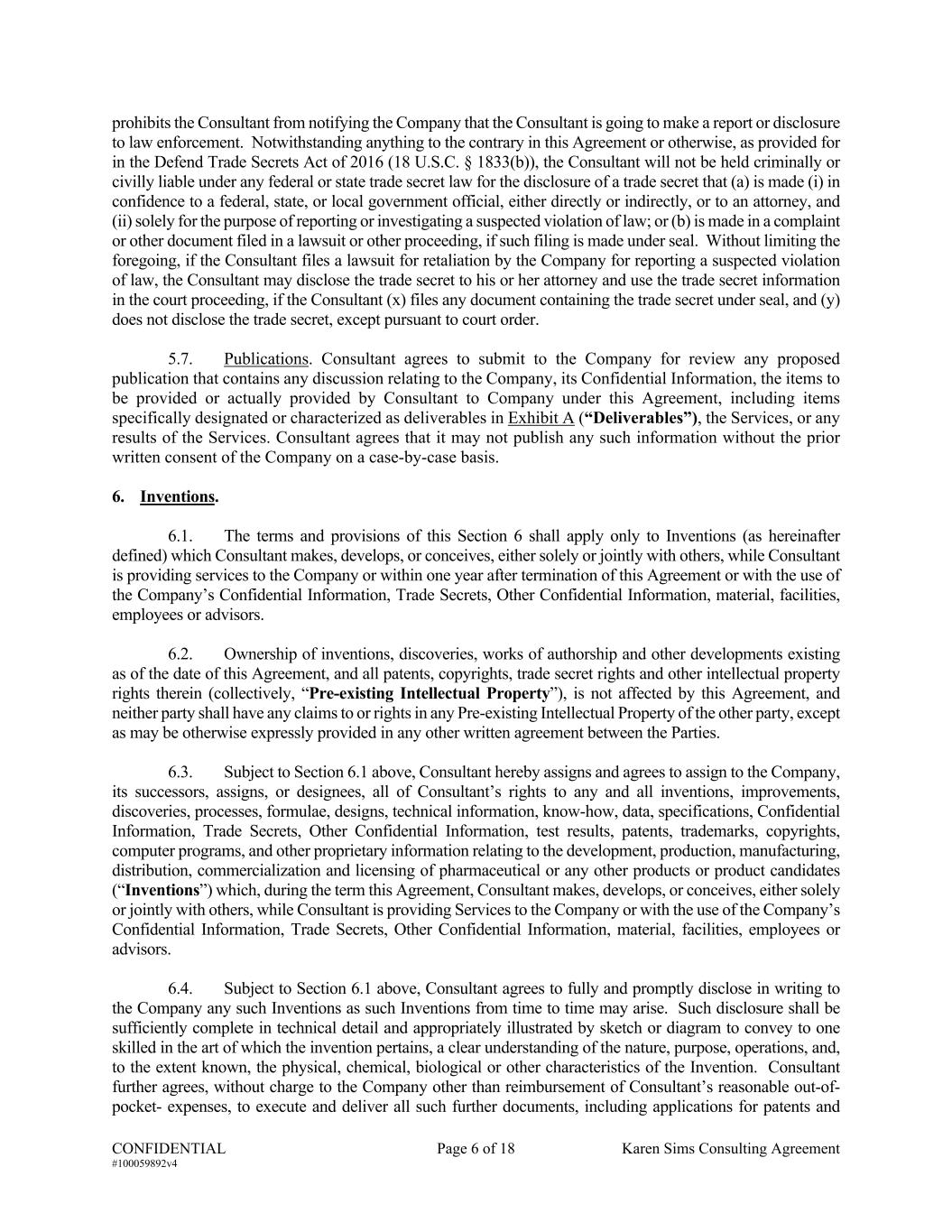机密第6页,共18页Karen Sims咨询协议# 100059892v4禁止顾问通知公司顾问将向执法部门作出报告或披露。尽管本协议或其他方面有任何相反的规定,如2016年《Defend商业秘密法》(18 U.S.C. § 1833(b))所规定,根据任何联邦或州商业秘密法,顾问将不会因(a)向联邦、州或地方政府官员(直接或间接)或向律师(或向律师)秘密披露商业秘密而承担刑事或民事责任,(ii)仅为报告或调查涉嫌违法行为的目的;或(b)在诉讼或其他程序中提交的投诉或其他文件中作出,如果此种提交是在盖章的情况下作出的。在不限制前述规定的情况下,如果顾问因举报涉嫌违法而提起公司报复诉讼,顾问可以向其代理律师披露该商业秘密,并在法院程序中使用该商业秘密信息,如果顾问(x)将任何包含该商业秘密的文件密封提交,并且(y)不披露该商业秘密,除非根据法院命令。5.7.出版物。Consultant同意向公司提交任何提议的出版物,以供审查,其中包含与公司有关的任何讨论、其机密信息、根据本协议将由Consultant向公司提供或实际提供的项目,包括在附件 A中特别指定或定性为可交付成果的项目(“可交付成果”)、服务或服务的任何结果。顾问同意,未经公司事先书面同意,不得以个案为基础发布任何该等信息。6.发明。6.1.本第6条的条款和规定仅适用于Consultant在向公司提供服务时或在本协议终止后一年内或在使用公司机密信息、商业秘密、其他机密信息、材料、设施、雇员或顾问的情况下单独或与他人共同作出、开发或构想的发明(定义见下文)。6.2.截至本协议日期已存在的发明、发现、作者身份作品和其他发展的所有权,以及其中的所有专利、版权、商业秘密权和其他知识产权(统称“已存在的知识产权”),不受本协议的影响,任何一方均不得对另一方已存在的任何知识产权拥有任何权利要求或权利,除非双方之间的任何其他书面协议另有明确规定。6.3.根据上述第6.1节的规定,顾问特此转让并同意将顾问对任何和所有发明、改进、发现、工艺、配方、设计、技术信息、专有技术、数据、规格、机密信息、商业秘密、其他机密信息、测试结果、专利、商标、版权、计算机程序以及与药品或任何其他产品或候选产品(“发明”)的开发、生产、制造、分销、商业化和许可有关的其他专有信息的所有权利转让给公司、其继任者、受让人或指定人,在本协议期限内,顾问单独或与他人共同作出、开发或构想,当顾问向公司提供服务或使用公司的机密资料、商业秘密、其他机密资料、材料、设施、雇员或顾问。6.4.在符合上述第6.1节的规定下,顾问同意以书面向公司充分及迅速披露任何该等发明,因为该等发明可能不时出现。此类披露应在技术细节上足够完整,并以草图或图表进行适当说明,以向发明所涉及的艺术方面的一名技术熟练人员传达对发明的性质、目的、操作以及在已知范围内的物理、化学、生物或其他特征的清晰理解。Consultant进一步同意,除补偿Consultant的合理自付费用外,不向公司收取费用,执行和交付所有这些进一步的文件,包括专利申请和