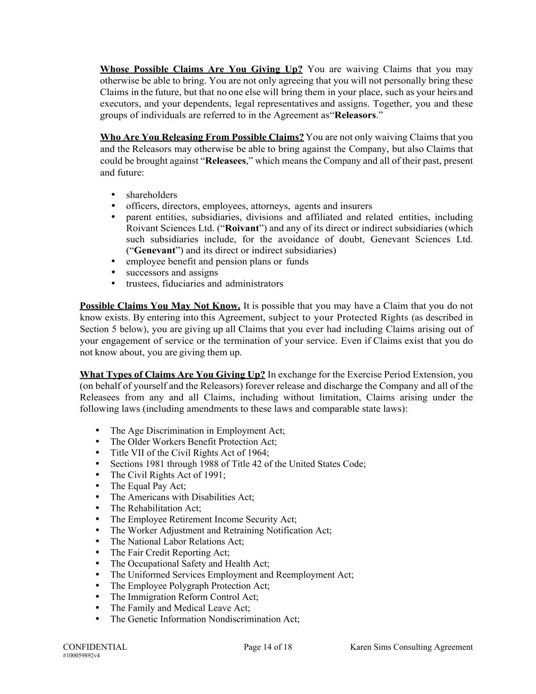 机密第14页,共18页Karen Sims咨询协议# 100059892v4你在放弃谁的可能索赔?您正在放弃您可能能够带来的索赔。你不只是同意你以后不会亲自提这些债权,而是不会有其他人代替你提这些债权,比如你的继承人和被执行人,以及你的受抚养人、法定代理人和受让人。你和这些个人团体在协议中被称为“释放”。你在为谁解除可能的索赔?你不仅放弃了你和释放人员可能以其他方式对公司提出的索赔,还放弃了可能对“释放人员”提出的索赔,这意味着公司及其所有过去、现在和未来:股东高级职员、董事、雇员、律师、代理人和保险公司的母实体、子公司、部门以及关联和相关实体,包括Roivant Sciences Ltd.(“Roivant”)及其任何直接或间接子公司(为免生疑问,这些子公司包括Genevant Sciences Ltd.(“Genevant”)及其直接或间接子公司)的员工福利和养老金计划或基金继任者,以及指派受托人、受托人和管理人您可能不知道的可能索赔。有可能你可能有一个你不知道存在的索赔。通过订立本协议,受限于您的受保护权利(如下文第5节所述),您放弃了您曾经拥有的所有索赔,包括因您从事服务或终止服务而产生的索赔。即使存在你不知道的索赔,你也是在放弃它们。你在放弃什么类型的理赔?作为行权期延长的交换条件,您(代表您自己和解押人)永远解除和解除公司和所有解押人的任何和所有索赔,包括但不限于,根据以下法律(包括对这些法律和类似州法律的修正)产生的索赔:《就业年龄歧视法案》;《老年工人福利保护法》;1964年《民权法案》第七章;《美国法典》第42章第1981至1988年条款;1991年《民权法案》;《同工同酬法案》;《美国残疾人法案》;《康复法案》;《雇员退休收入保障法》;《工人调整法》和再培训通知法;《国家劳动关系法》;《公平信用报告法》;《职业安全和健康法》;《制服服务就业和再就业法》;《雇员测谎保护法》;《移民改革控制法》;《家庭和病假法》;《遗传信息非歧视法》;
