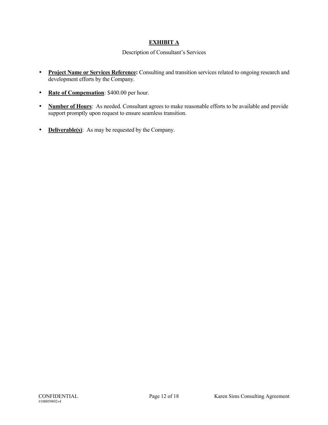 机密第12页,共18页Karen Sims咨询协议# 100059892v4附件A顾问服务说明项目名称或服务参考:与公司正在进行的研发工作相关的咨询和过渡服务。报酬标准:每小时400.00美元。小时数:视需要。咨询人同意作出合理努力,以备不时之需,并应要求迅速提供支持,以确保无缝过渡。可交付成果:根据公司的要求。