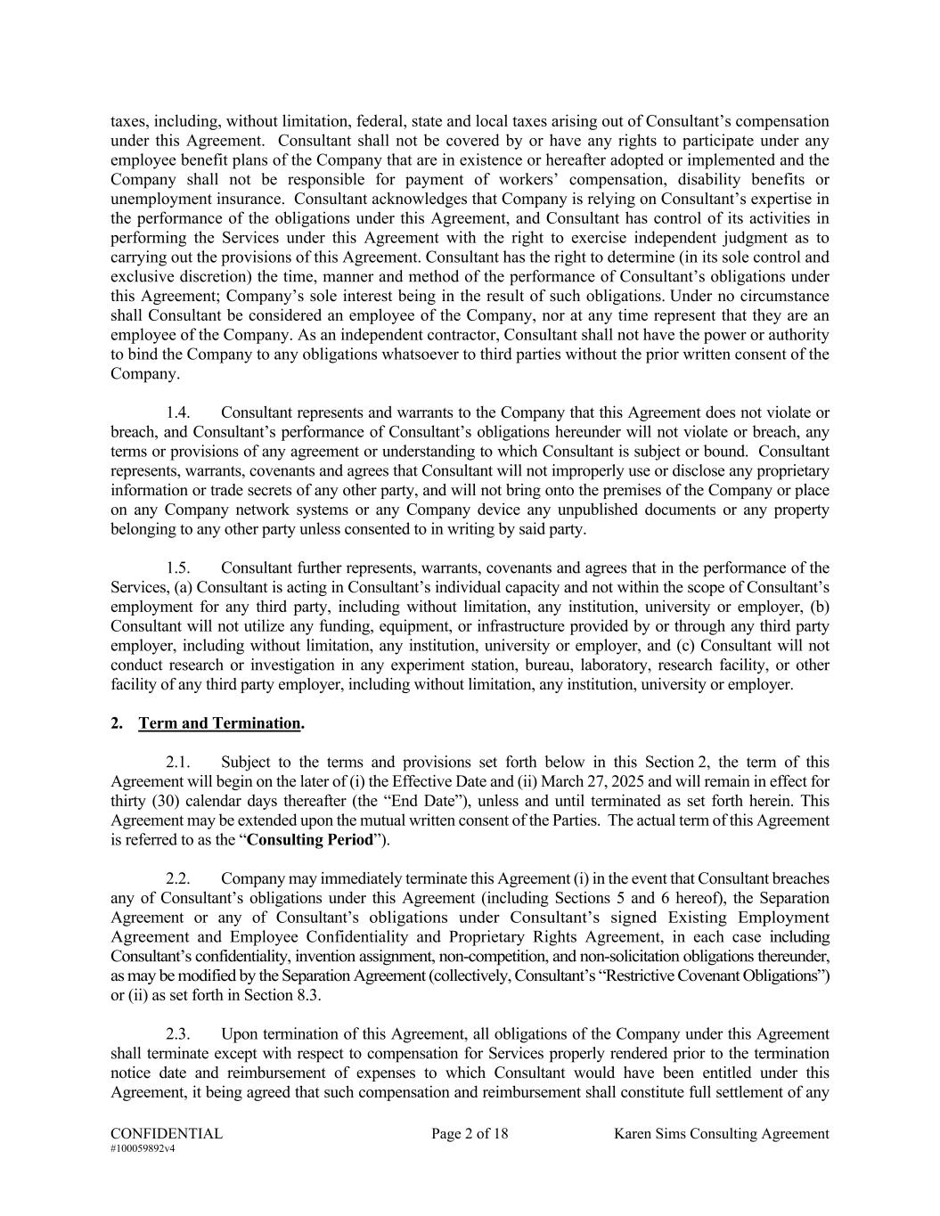 机密第2页,共18页Karen Sims咨询协议# 100059892v4税,包括但不限于因顾问根据本协议获得补偿而产生的联邦、州和地方税。顾问不受现有或以后通过或实施的公司任何员工福利计划的覆盖或有任何权利参与且公司不负责支付工人赔偿、伤残福利或失业保险。Consultant承认,公司在履行本协议项下义务方面依赖于Consultant的专业知识,并且Consultant控制其在履行本协议项下服务方面的活动,并有权对执行本协议的规定行使独立判断。顾问有权(在其单独控制和专属酌处权下)确定顾问履行本协议义务的时间、方式和方法;公司在此类义务的结果中的唯一利益。在任何情况下,顾问不得被视为公司的雇员,也不得在任何时候代表他们是公司的雇员。作为独立承包商,未经公司事先书面同意,顾问公司无权或授权约束公司对第三方承担任何义务。1.4.顾问向公司声明并保证,本协议不违反或违反,顾问履行顾问在本协议项下的义务不会违反或违反顾问受其约束或约束的任何协议或谅解的任何条款或规定。顾问声明、保证、承诺并同意,顾问将不会不正当地使用或披露任何其他方的任何专有信息或商业秘密,并且不会将任何未公布的文件或属于任何其他方的任何财产带入公司场所或放置在任何公司网络系统或任何公司设备上,除非该方书面同意。1.5.Consultant进一步声明、保证、承诺并同意,在履行服务时,(a)Consultant以Consultant的个人身份行事,不在Consultant为任何第三方(包括但不限于任何机构、大学或雇主)雇用的范围内,(b)Consultant不会使用任何由或通过任何第三方雇主(包括但不限于任何机构、大学或雇主)提供的任何资金、设备或基础设施,以及(c)Consultant不会在任何实验站、局、实验室、研究设施或任何第三方雇主的其他设施中进行研究或调查,包括但不限于任何机构,大学或雇主。2.任期和终止。2.1.在不违反本条第2款下文所述条款和规定的情况下,本协议的期限将从(i)生效日期和(ii)2025年3月27日(以较晚者为准)开始,并将在此后三十(30)个历日(“终止日期”)内继续有效,除非并直至本协议规定的终止。经双方相互书面同意,本协议可延期。本协议的实际期限简称“咨询期”)。2.2.公司可立即终止本协议(i),如果顾问违反本协议(包括本协议第5和6条)、离职协议或顾问签署的现有雇佣协议和员工保密和专有权利协议项下的任何顾问义务,在每种情况下包括顾问的保密、发明转让、不竞争和根据其规定的不招揽义务,可由离职协议(统称为顾问的“限制性契约义务”)修改,或(ii)根据第8.3节的规定。2.3.本协议终止后,本公司在本协议下的所有义务均应终止,但在终止通知日期之前适当提供的服务的补偿以及顾问根据本协议本应有权获得的费用的偿还方面除外,经商定,此种补偿和偿还应构成对任何