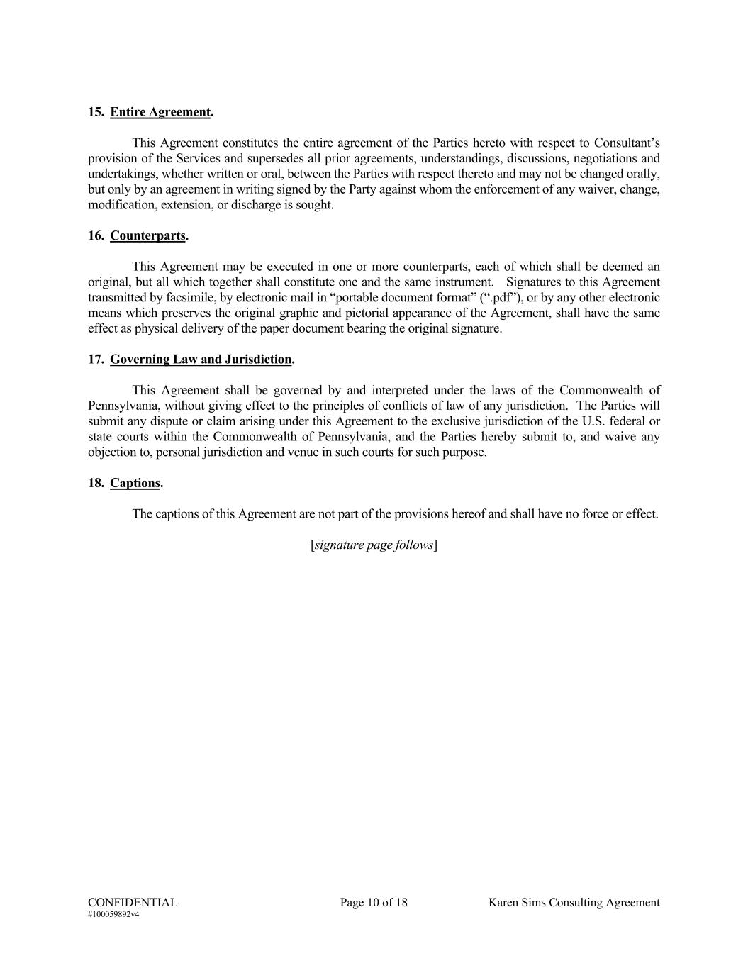 机密第10页,共18页Karen Sims咨询协议# 100059892v4 15。全部协议。本协议构成本协议双方就顾问公司提供服务达成的全部协议,并取代双方之前就此达成的所有书面或口头协议、谅解、讨论、谈判和承诺,不得口头更改,而只能通过被寻求强制执行任何放弃、变更、修改、延期或解除的一方签署的书面协议。16.同行。本协议可以在一个或多个对应方签署,每一份协议应被视为原件,但所有这些共同构成一份和同一份文书。以传真、以“便携式文件格式”(“.pdf”)的电子邮件或以任何其他电子方式保存协议原始图形和图形外观的方式传送的本协议签字,与实际交付带有原始签字的纸质文件具有同等效力。17.管辖法律和管辖权。本协议应受宾夕法尼亚州联邦法律管辖和解释,但不影响任何司法管辖区的法律冲突原则。双方将根据本协议产生的任何争议或索赔提交宾夕法尼亚州联邦范围内的美国联邦或州法院的专属管辖权,双方特此提交并放弃对此目的在此类法院的属人管辖权和地点的任何异议。18.字幕。本协议的标题不属于本协议条款的一部分,不具有任何效力。【签名页如下】