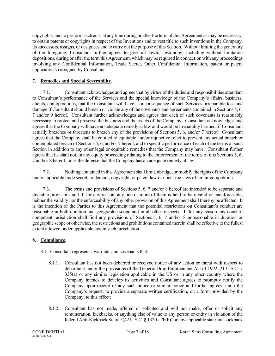 机密第7页,共18页Karen Sims Consulting Agreement # 100059892v4版权,并在本协议期限内或之后可能需要的任何时间执行此类行为,以获得有关发明的专利或版权,并将此类发明的所有权归属于公司、其继承人、受让人或指定人,并执行本节的目的。在不限制前述内容的概括性的情况下,Consultant进一步同意在本协议期限期间或之后提供所有合法证词,包括但不限于证词,这可能是与涉及任何机密信息、商业秘密、其他机密信息、专利或由Consultant如此转让的专利申请的任何程序有关的要求。7.补救措施和特殊可分割性。7.1.顾问承认并同意,由于顾问履行服务所伴随的义务和责任以及对公司事务、业务、客户和运营的特殊了解,如果顾问违反或违反本协议第5、6、7和/或9节所载的任何契诺和协议,则顾问将因此类服务而遭受不可弥补的损失和损害。Consultant进一步承认并同意,为保护和保全公司的业务和资产,每一项此类契约都是合理必要的。Consultant承认并同意,如果Consultant实际违反或威胁违反本协议第5、6和/或7条的任何规定,公司将在法律上没有充分的补救措施,并将受到不可挽回的损害。顾问同意,公司有权获得衡平法和/或禁令救济,以防止任何实际违反或预期违反本协议第5、6和/或7条,并有权在公司可能拥有的任何其他法律或衡平法补救措施之外具体履行该条的每一项条款。Consultant进一步同意,在与执行本协议第5、6、7和/或8条条款有关的任何股权程序中,他不得提出公司在法律上拥有充分补救措施的抗辩。7.2.本协议不得限制、删减、修改公司在适用的商业秘密、商标、版权、专利法或不正当竞争法下的权利。7.3.本协议第5、6、7和/或8节的条款和规定旨在成为单独和可分割的规定,如果出于任何原因认为其中任何一项或多项无效或不可执行,则本协议的任何其他规定的有效性或可执行性均不因此而受到影响。本协议各方的意图是,对顾问行为的潜在限制在持续时间和地理范围以及所有其他方面都是合理的。如任何有管辖权的法院因任何理由认为第5、6、7和/或8条的任何规定在期限或地域范围或其他方面不合理,则其中所载的限制和禁止应在该司法管辖区的适用法律允许的最大范围内有效。8.合规。8.1.顾问表示、保证和承诺:8.1.1。根据1992年《仿制药执法法》、21 U.S.C. § 335(a)或在美国或公司打算开展其活动的任何其他国家适用的任何类似立法的规定,Consultant没有被取消资格或收到任何与取消资格有关的行动或威胁的通知,并且Consultant同意在收到任何此类通知或类似通知后立即通知公司,并进一步同意应公司的请求,在公司提供的表格上提供单独的书面证明,大意为8.1.2。Consultant没有违反联邦反回扣法规(42 U.S.C. § 1320-a7b(b))或任何适用的州反回扣,向任何个人或实体提供、提供或索取任何报酬、回扣或任何其他有价值的东西