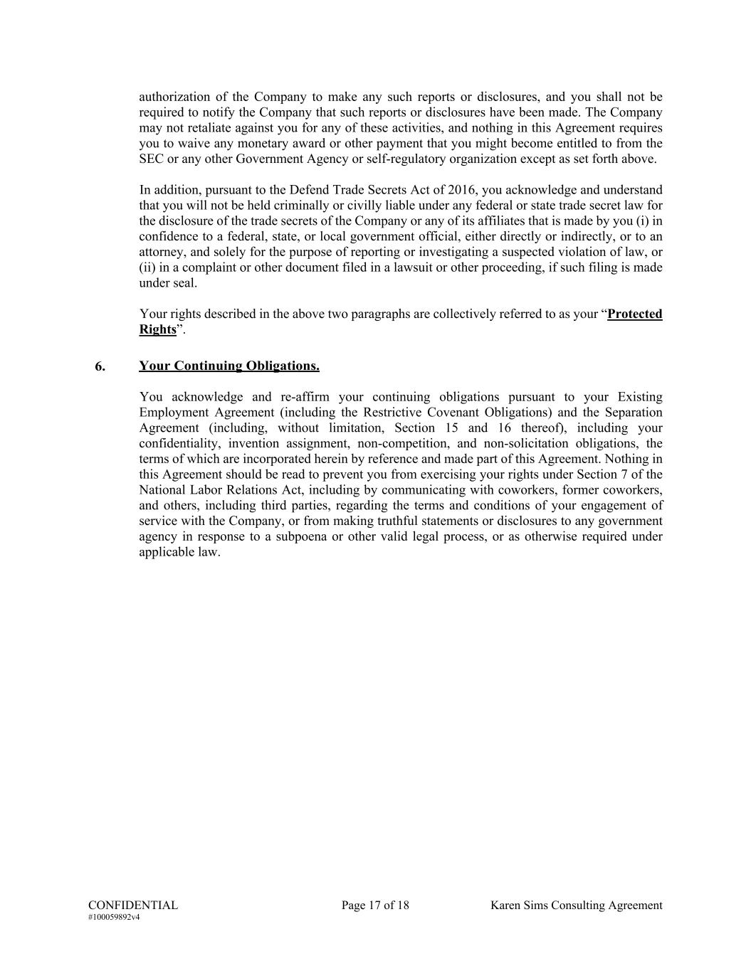 机密第17页,共18页Karen Sims Consulting Agreement # 100059892v4授权公司作出任何该等报告或披露,而你无须通知公司已作出该等报告或披露。公司不得就任何这些活动对您进行报复,本协议中的任何内容均不要求您放弃您可能有权从SEC或任何其他政府机构或自律组织获得的任何金钱奖励或其他付款,除非上述规定。此外,根据2016年《捍卫商业秘密法》,您承认并理解,根据任何联邦或州商业秘密法,您将不会因您(i)直接或间接向联邦、州或地方政府官员或向律师秘密披露公司或其任何关联公司的商业秘密而被追究刑事或民事责任,仅为报告或调查涉嫌违法行为的目的,或(ii)在诉讼或其他程序中提交的投诉或其他文件中,如果此类提交是在盖章的情况下提交的。您在上述两段中描述的权利,统称为您的“受保护权利”。6.您的持续义务。您确认并重申您根据您现有的雇佣协议(包括限制性契约义务)和离职协议(包括但不限于其中第15和16条)承担的持续义务,包括您的保密、发明转让、不竞争和不招揽义务,其条款通过引用并入本文并成为本协议的一部分。本协议中的任何内容均不得阻止您根据《国家劳动关系法》第7条行使您的权利,包括与同事、前同事和其他人(包括第三方)就您与公司合作服务的条款和条件进行沟通,或根据传票或其他有效法律程序向任何政府机构作出如实陈述或披露,或根据适用法律的其他要求。