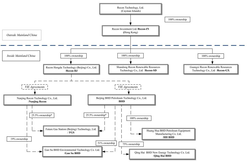 我们是一家开曼群岛控股公司。我们不是中国运营公司,不直接在中国开展业务运营。所有中国业务均由我们在中华人民共和国(“中国”或“中国”)和中华人民共和国香港特别行政区(“香港特区”或“香港”)成立的子公司,以及我们与可变利益实体或“VIE”的合同安排以及VIE位于中国的子公司进行。这是开曼群岛控股公司的证券发行,不进行运营。这种结构给投资者带来了独特的风险。VIE结构为外国对中国公司的投资提供了合同风险敞口,据此,美国公认会计准则会计规则要求我们在财务报表中合并此类VIE的财务业绩。VIE结构一般用于中国法律禁止外国直接投资运营公司的情况。投资者可能永远不会直接持有中国运营公司的股权。除非另有说明,如本招股章程所用以及在描述我们的运营和综合财务信息时所用,“我们”、“我们”、“公司”或“我们的”指研控科技(集团)有限公司,一家开曼群岛豁免有限公司,连同我们的附属公司。“我们的子公司”是指康健投资有限公司、康健恒达科技(北京)有限公司、山东康健再生资源科技有限公司、广西康健再生资源科技有限公司,或分别为康健-IN、康健-BJ、康健-SD、康健-GX。“VIE”是指中国的可变利益实体及其子公司(南京研控科技、北京BHD石油技术有限公司、甘苏BHD Environmental Technology Co. Ltd.、Huanghua BHD石油设备制造有限公司、青海BHD新能源科技有限公司、未来加油站(北京)科技有限公司,或分别为“南京Recon”、“BHD”、“甘苏BHD”、“HH BHD”、“青海BHD”、“FGS”)。你投资的不是南京研控、BHD、甘苏BHD、HH BHD、青海BHD、FGS。相反,我们订立了日期为2019年4月1日的若干合同(“VIE协议”),这些合同用于向投资者提供中国法律禁止或限制对运营公司的直接外国投资的中国公司的外国投资敞口。外商独资实体(“WFOE”)是一家总部设在中华人民共和国但由外国投资者全资拥有的有限责任公司。在我们的例子中,RECON-BJ是一家WFOE,由我们通过我们的子公司RECON-IN(一家香港有限公司)全资拥有。由于我们直接拥有WFOE和VIE协议,出于会计目的,我们被视为VIE的主要受益人。