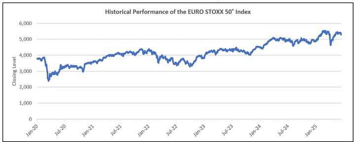 下图说明了欧元斯托克50的表现®2020年1月2日至2025年6月16日指数。欧元StoXX50的收盘水平®2025年6月16日指数为5339.57。