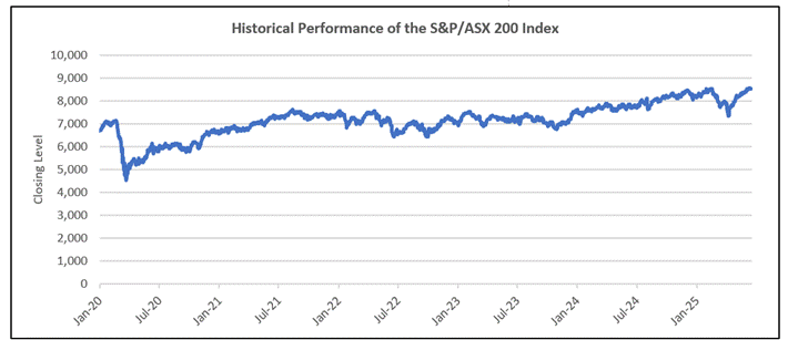 下图图示的是2020年1月2日-2025年6月16日期间标普/ASX 200指数的表现。标普/ASX 200指数2025年6月16日收盘点位为8,548.373点。