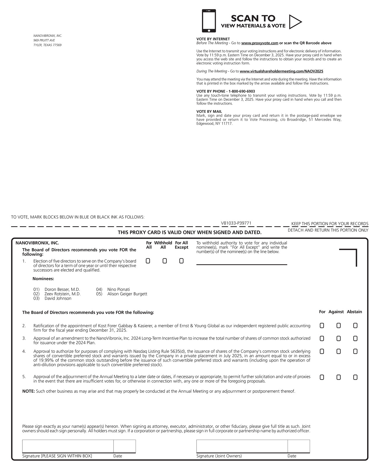 诚邀您参加将于美国东部时间2025年12月4日上午10:00在www.virtualshareholdermeeting.com/NAOV2025举行的特拉华州公司NanoVibronix,Inc.(“我们”、“我们”、“我们的”或“公司”)2025年年度股东大会(“年度会议”)。为了向我们的股东提供访问权限,无论其地理位置如何,公司已确定年度会议将是一次完全通过网络直播进行的虚拟会议。您或您的代理持有人将能够通过访问www.virtualshareholdermeeting.com/NAOV2025并输入代理卡或投票指示表(如适用)上包含的16位控制号码,在线参加虚拟年会、投票和在年会期间提交问题。要获得参加虚拟年会的权限,注册股东和受益股东(通过股票经纪账户或由银行或其他记录持有人持有股份的股东)将需要遵循随附的代理声明中提供的适用于他们的指示。有关年度会议和将在年度会议上进行的业务的详细信息在随附的年度股东大会通知和代理声明中有更全面的描述。只有当你是截至2025年10月27日的股东时,你才有权在我们的年度会议和任何休会、延续或延期会议上投票。