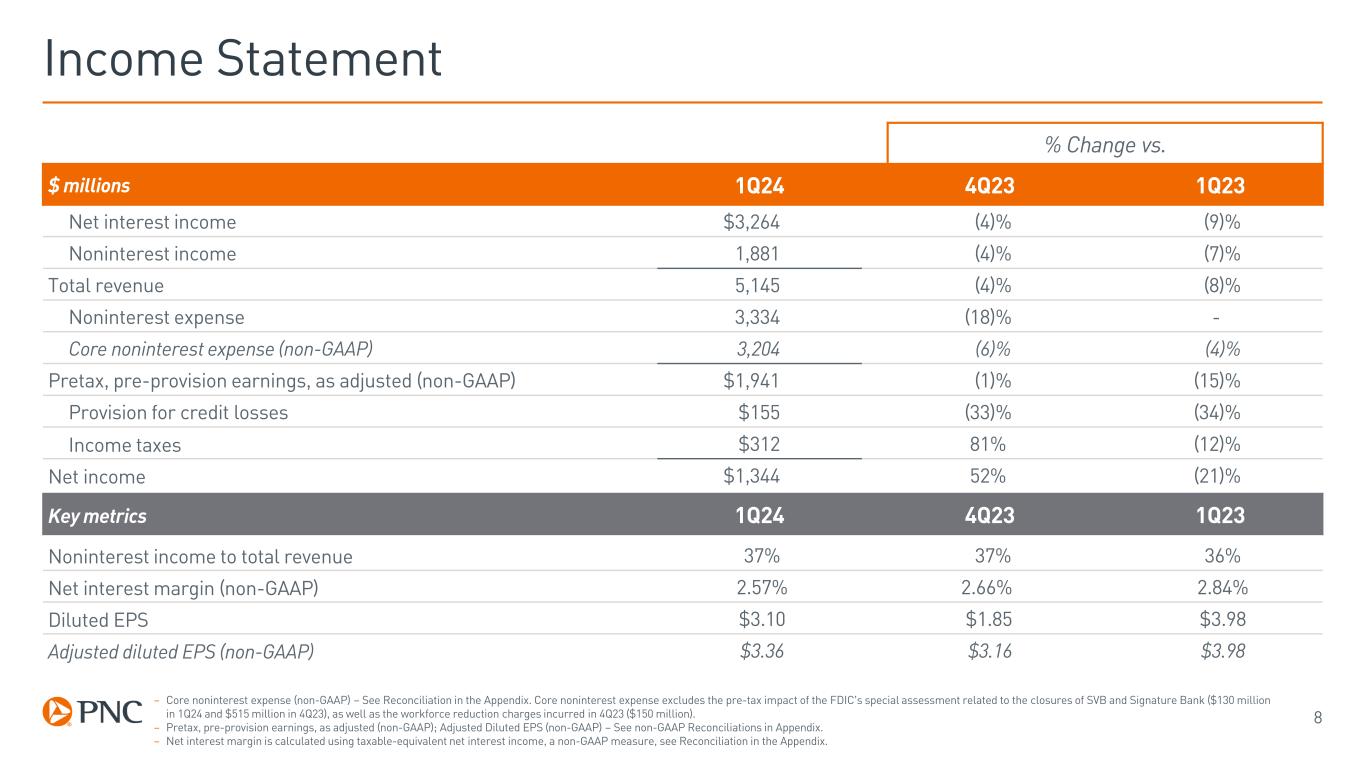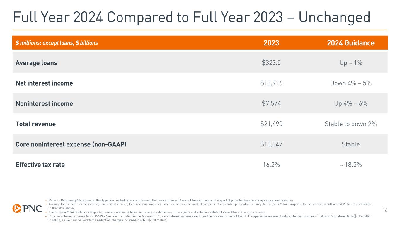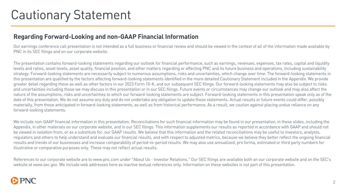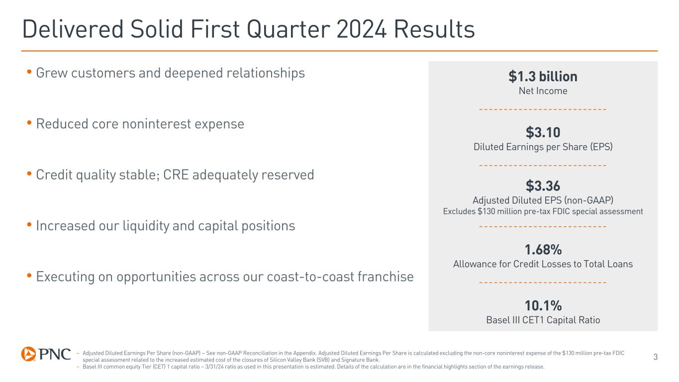 关于前瞻性和非公认会计准则财务信息,我们的收益电话会议演示文稿并非旨在作为一项完整的业务或财务审查,应结合PNC在其提交给美国证券交易委员会的文件和我们公司网站上提供的所有信息来看待。该演示文稿包含有关我们财务业绩前景的前瞻性陈述,例如收益、收入、费用、税率、资本和流动性水平和比率、资产水平、资产质量、财务状况,以及有关或影响PNC及其未来业务和运营的其他事项,包括可持续发展战略。前瞻性陈述必然受到众多假设、风险和不确定性的影响,这些假设、风险和不确定性会随着时间而变化。本演示文稿中的前瞻性陈述受到附录中更详细的警示性陈述中确定的影响前瞻性陈述的因素的限制。我们在2023年的10-K表格以及随后提交给美国证券交易委员会的文件中提供了有关这些因素以及其他因素的更多细节。我们的前瞻性陈述也可能受到风险和不确定性的影响,包括我们可能在本演示文稿或SEC文件中讨论的风险和不确定性。未来的事件或情况可能会改变我们的前景,也可能会影响我们的前瞻性陈述所受假设、风险和不确定性的性质。本演示文稿中的前瞻性陈述仅在本演示文稿发布之日发表。我们不承担任何责任,也不承担更新这些声明的任何义务。实际结果或未来事件可能与前瞻性陈述中的预期以及历史表现存在重大差异。因此,我们告诫不要过分依赖任何前瞻性陈述。我们在本演示文稿中包含了非GAAP财务信息。此类财务信息的对账可在我们的演示文稿、这些幻灯片(包括附录)、我们公司网站上的其他材料以及我们提交给美国证券交易委员会的文件中找到。这些信息补充了我们根据GAAP报告的结果,不应与我们的GAAP结果分开看待,或作为我们的GAAP结果的替代品。我们认为,这些信息和相关的对账可能有助于投资者、分析师、监管机构和其他人理解和评估我们的财务业绩,以及调整后的指标,因为我们认为它们更好地反映了我们业务的持续财务业绩和趋势,并增加了期间业绩的可比性。我们也可能仅出于说明或比较目的使用年化、备考、估计或第三方数字。这些可能无法反映实际结果。对我们公司网站的引用,请参阅www.pnc.com下的“关于我们-投资者关系”。我们的SEC文件可在我们的公司网站和SEC网站www.sec.gov上查阅。我们在此仅作为非活动文本引用包含网址。这些网站上的信息不属于这个演示文稿的一部分。2警示性声明