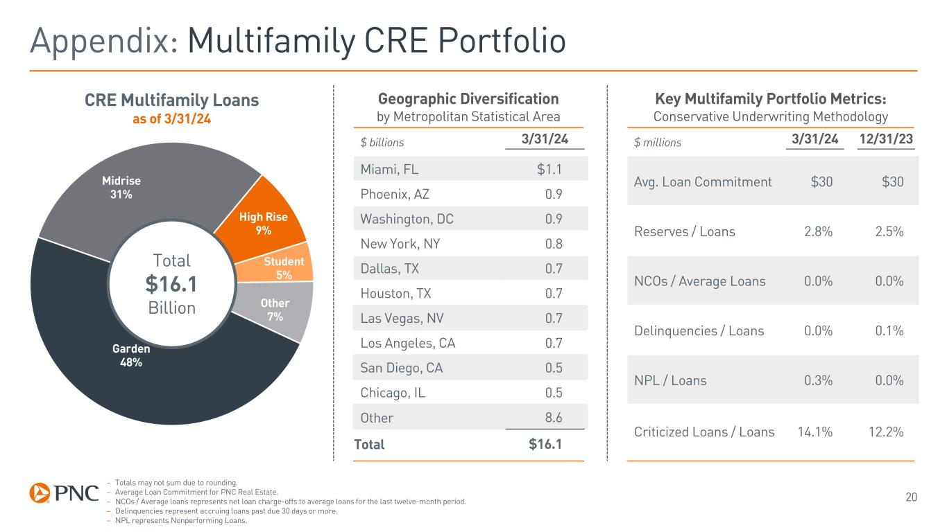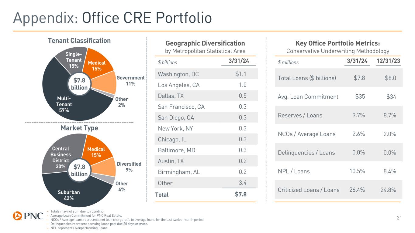 附录:多户CRE投资组合20 Garden 48% Midrise 31% High rise 9% Student 5% Other 7% CRE MultiFamily Loans as of 3/31/24 totaling $ 161亿– total may not sum due to四舍五入。– PNC房地产的平均贷款承诺。– NCO/平均贷款代表过去12个月期间平均贷款的净贷款冲销。–拖欠是指逾期30天或更长时间的应计贷款。– NPL代表不良贷款。按大都会统计区划分的地理多样化十亿美元3/31/24迈阿密,FL $ 1.1凤凰城,AZ 0.9华盛顿特区0.9纽约,NY 0.8达拉斯,TX 0.7休斯顿,TX 0.7拉斯维加斯,NV 0.7洛杉矶,加利福尼亚州 0.7圣地亚哥,加利福尼亚州 0.5芝加哥,IL 0.5其他8.6总计16.1美元关键多户家庭投资组合指标:保守承销方法百万美元3/31/24 12/31/23平均。贷款承诺30美元30美元准备金/贷款2.8% 2.5% NCO/平均贷款0.0% 0.0%拖欠/贷款0.0% 0.1%不良贷款/贷款0.3% 0.0%批评贷款/贷款14.1% 12.2%