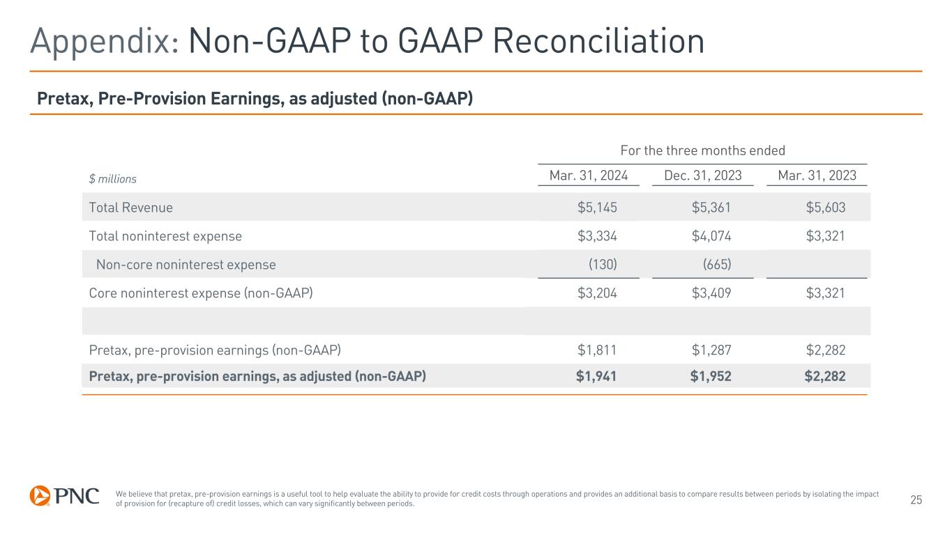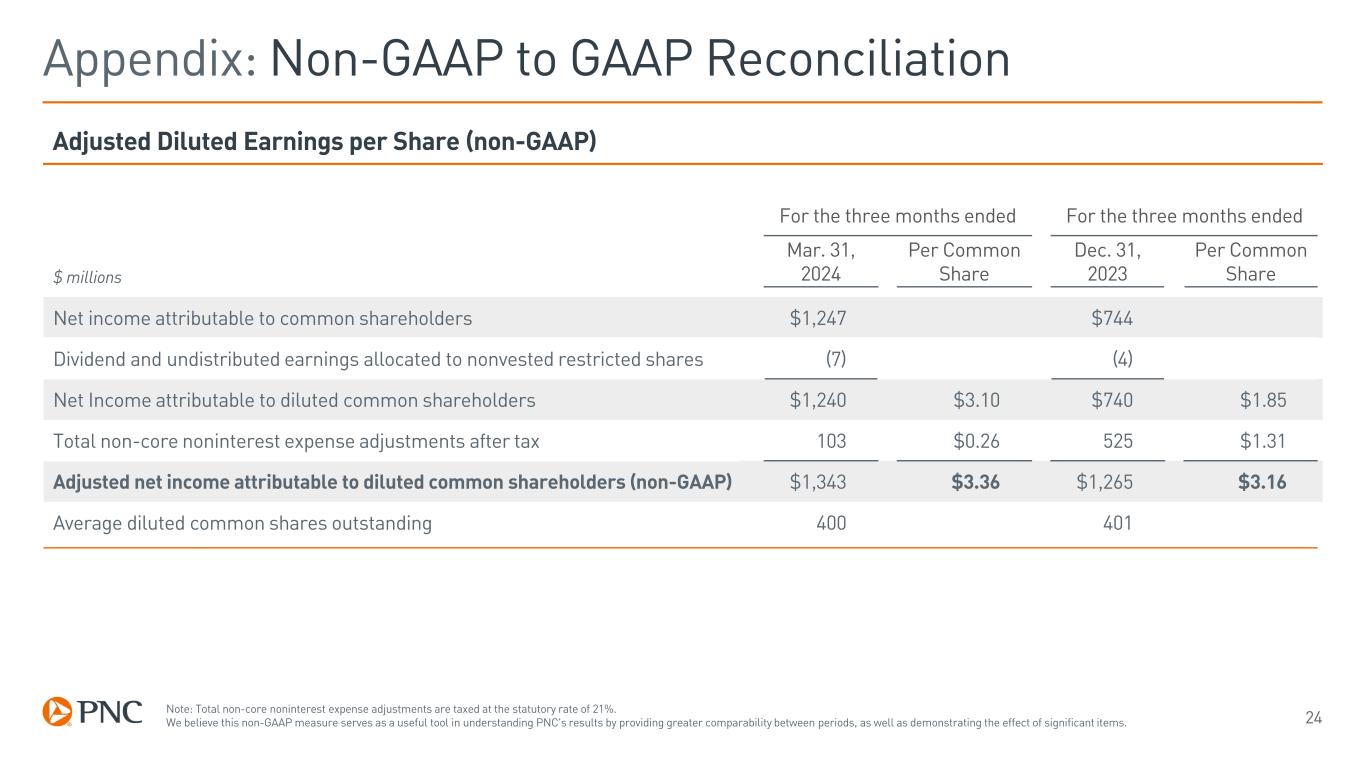 附录:Non-GAAP与GAAP调节24注:非核心非利息费用调整总额按21%的法定税率征税。我们认为,这种非GAAP衡量标准通过提供更大的期间之间的可比性以及展示重要项目的效果,可以成为理解PNC结果的有用工具。截至2024年3月31日止三个月每股普通股百万美元2023年12月31日止三个月每股普通股净利润归属于普通股股东的净利润1,247美元744美元分配给非既得限制性股票的股息和未分配收益(7)(4)归属于稀释后普通股股东的净利润1,240美元3.10美元740美元1.85美元税后非核心非利息费用调整总额103美元0.26525美元1.31美元调整后归属于稀释后普通股股东的净利润(非公认会计准则)1,343美元3.36美元1,265美元3.16已发行稀释普通股平均股400401调整后稀释每股收益(非公认会计准则)