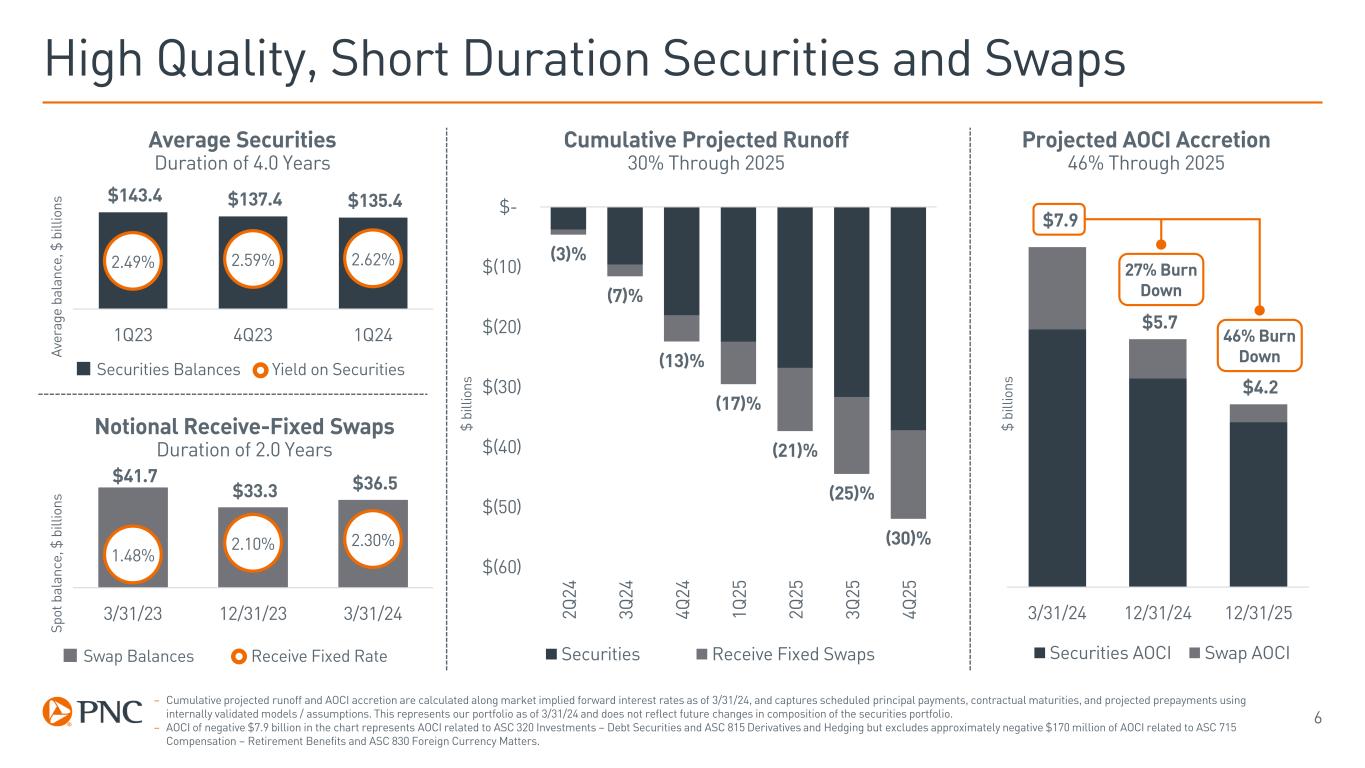 $ 41.7 $ 33.3 $ 36.5 1.48% 2.10% 2.30% 3/31/2312/31/233/31/246高质量、短期证券和掉期–累计预计径流和AOCI增值是根据截至3/31/24的市场隐含远期利率计算的,并使用内部验证的模型/假设捕获预定本金支付、合同到期日和预计预付款。这代表我们截至3/31/24的投资组合,不反映未来证券投资组合构成的变化。–图表中负79亿美元的AOCI代表与ASC 320投资–债务证券和ASC 815衍生品和对冲相关的AOCI,但不包括与ASC 830外币事项相关的约负1.7亿美元的AOCI。平均证券存续期4.0年$ 143.4 $ 137.4 $ 135.4 2.49% 2.59% 2.62% 1Q23 4Q23 1Q24名义收款-固定掉期存续期2.0年(3)%(7)%(13)%(17)%(21)%(25)%(30)% $(60)$(50)$(40)$(30)$(20)$-2Q24 3Q24 4Q24 1Q25 2Q25 3Q25 4Q25证券收到固定掉期累计预计径流30%到2025年预计AOCI增量46%到2025年$ 7.9 $ 5.7 $ 4.23/31/2412/31/24 12/31/25证券AOCI Swap AOCI SP ot b al an ce,$ b ill io ns AV er AG e$ b ill io ns 27% burn down 46% burn down $ bi lli on s $ bi lli on s swap balances receive fixed rate securities balances yield on securities