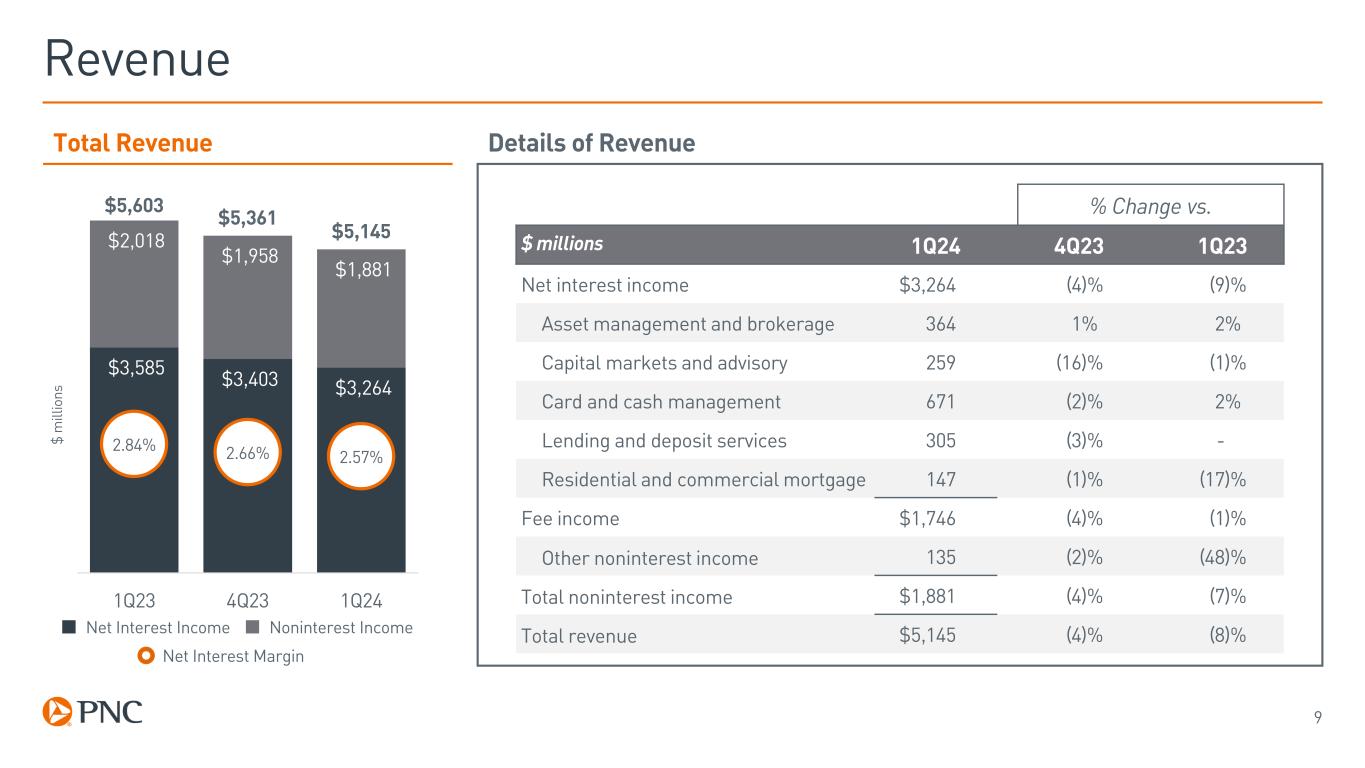 8损益表%变动% vs.百万美元1Q24 4Q23 1Q23净利息收入$ 3,264(4)%(9)%非利息收入1,881(4)%(7)%总收入5,145(4)%(8)%非利息费用3,334(18)%-核心非利息费用(non-GAAP)3,204(6)%(4)%税前、拨备前收益,经调整(非公认会计原则)$ 1,941(1)%(15)%信贷损失准备金$ 155(33)%(34)%所得税$ 31281%(12)%净收入$ 1,34452%(21)%关键指标1Q24 4Q23 1Q23非利息收入占总收入37% 37% 36%净息差(非公认会计原则)2.57% 2.66% 2.84%稀释后每股收益$ 3.10 $ 1.85 $ 3.98调整后稀释后每股收益(非公认会计原则)$ 3.36 $ 3.16 $ 3.98 –核心非利息费用(非公认会计原则)–见附录中的调节。核心非利息费用不包括FDIC与关闭SVB和Signature银行相关的特别评估的税前影响(24年第一季度为1.3亿美元,23年第四季度为5.15亿美元),以及23年第四季度产生的裁员费用(1.5亿美元)。–调整后的税前、拨备前收益(non-GAAP);调整后的稀释后每股收益(non-GAAP)–见附录中的非GAAP调节。–净息差使用应税等值净利息收入计算,这是一种非公认会计原则的衡量标准,见附录中的调节。
