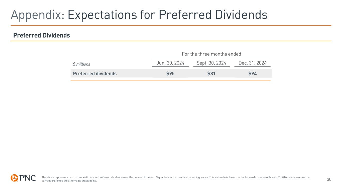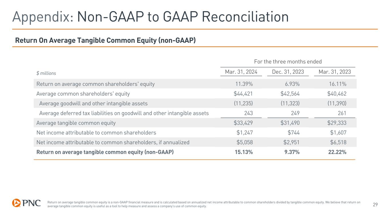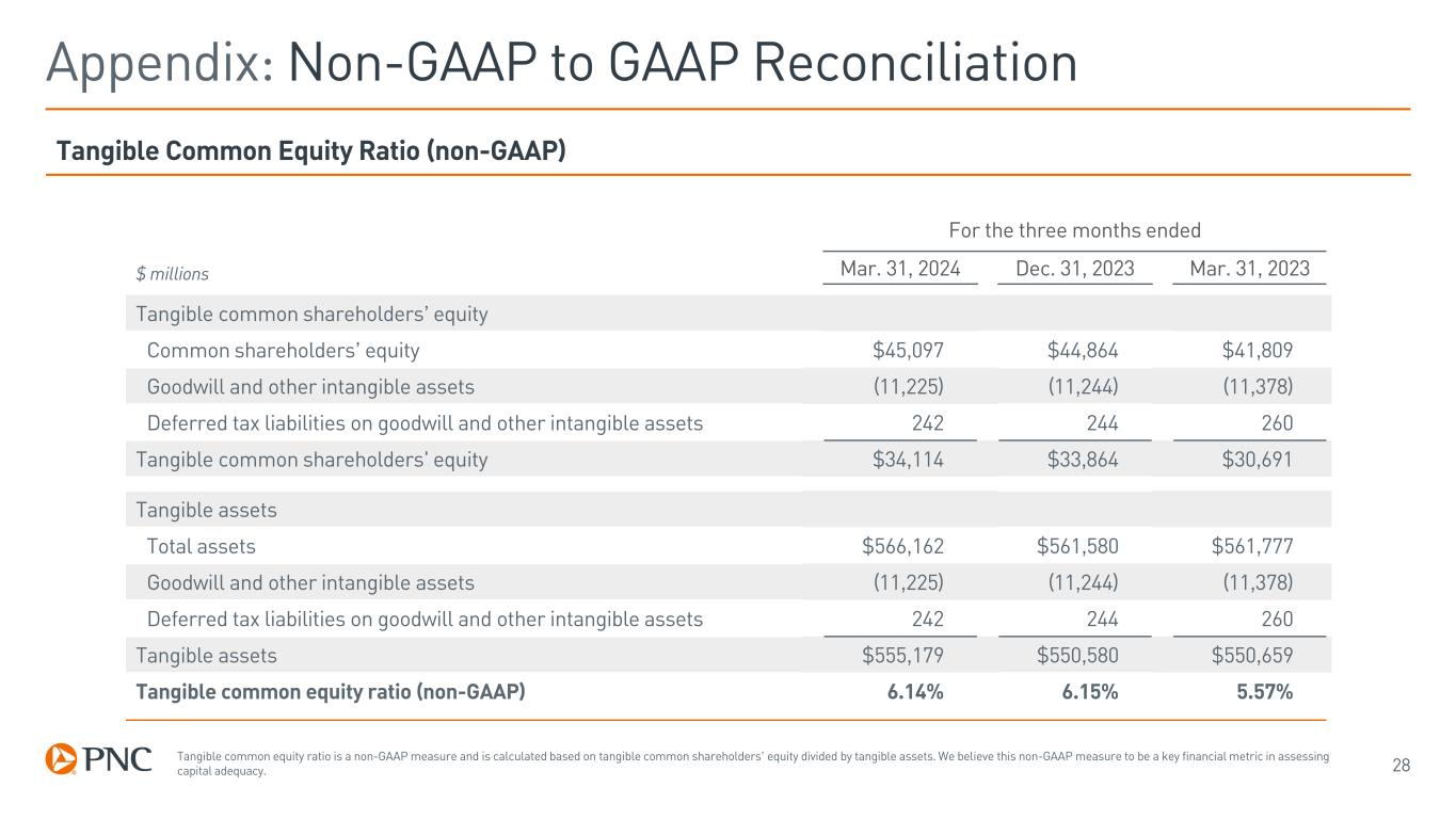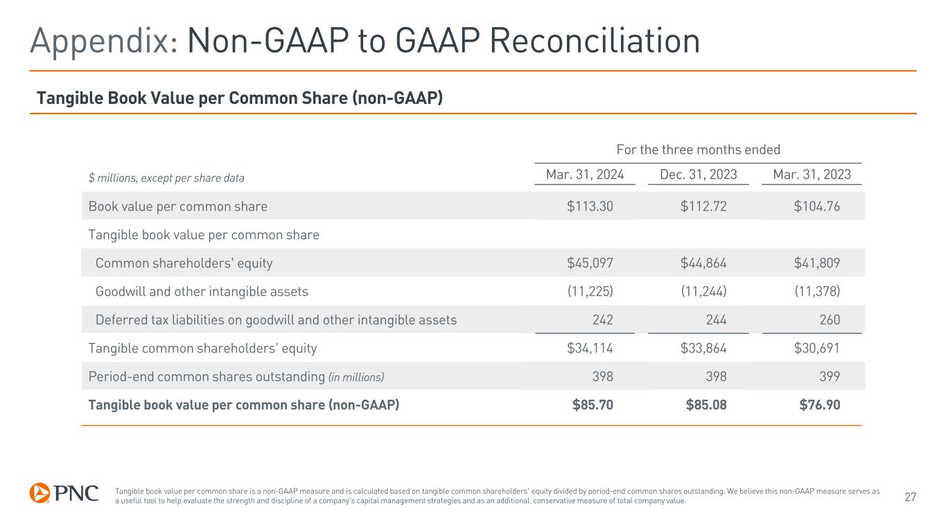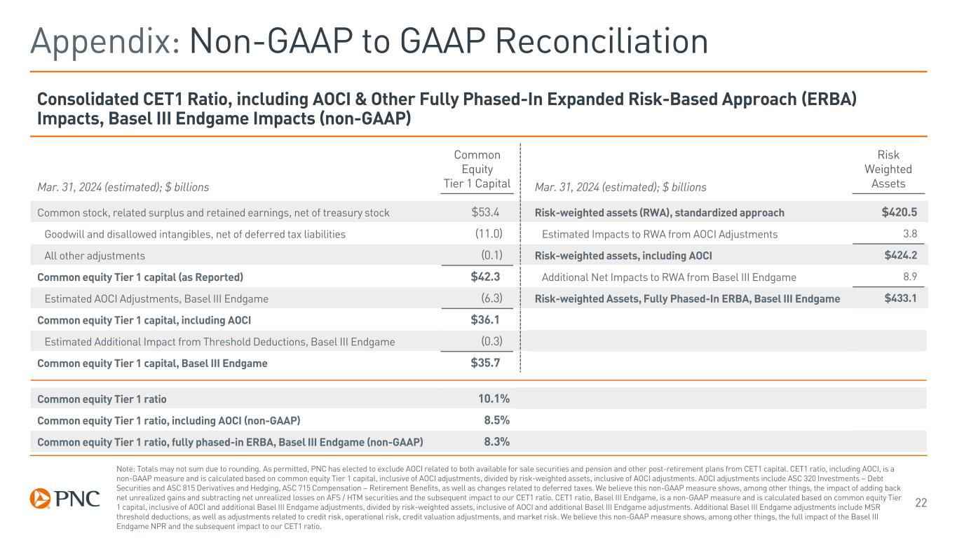 附录:非GAAP与GAAP调节2024年3月31日22日(估计);数十亿美元普通股一级资本2024年3月31日(估计);数十亿美元风险加权资产普通股、相关盈余和留存收益,扣除库存股53.4美元风险加权资产(RWA),标准化方法420.5美元商誉和不允许的无形资产,扣除递延税项负债(11.0)AOCI调整对RWA的估计影响3.8所有其他调整(0.1)风险加权资产,包括AOCI 424.2美元普通股一级资本(如报告)42.3美元巴塞尔协议III终局对RWA的额外净影响8.9估计AOCI调整,巴塞尔协议III终局(6.3)风险加权资产,完全分阶段ERBA,巴塞尔协议III Endgame 433.1美元普通股权一级资本,包括AOCI36.1美元估计来自阈值扣除的额外影响,巴塞尔协议III Endgame(0.3)普通股权一级资本,巴塞尔协议III Endgame 35.7美元普通股权一级资本比率10.1%普通股权一级资本比率,包括AOCI(non-GAAP)8.5%普通股权一级资本比率,完全分阶段ERBA,巴塞尔协议III Endgame(non-GAAP)8.3%注:由于四舍五入,总数可能不相加。在允许的情况下,PNC已选择将与可供出售证券和养老金及其他退休后计划相关的AOCI从CET1资本中排除。CET1比率,包括AOCI,是一种非GAAP衡量标准,计算基础是普通股权一级资本,包括AOCI调整,除以风险加权资产,包括AOCI调整。AOCI调整包括ASC 320投资–债务证券和ASC 815衍生品和对冲,ASC 715补偿–退休福利,以及与递延税款相关的变化。我们认为,除其他外,这一非GAAP衡量标准显示了加回未实现净收益和减去未实现净亏损对AFS/HTM证券的影响以及对我们的CET1比率的后续影响。CET1比率,即巴塞尔协议III Endgame,是一种非公认会计准则衡量标准,根据普通股权一级资本计算,包括AOCI和额外的巴塞尔协议III Endgame调整,除以风险加权资产,包括AOCI和额外的巴塞尔协议III Endgame调整。额外的巴塞尔III终局调整包括MSR阈值扣除,以及与信用风险、操作风险、信用估值调整和市场风险相关的调整。我们认为,这一非GAAP衡量标准显示,除其他外,巴塞尔协议III终局NPR的全面影响以及随后对我们的CET1比率的影响。合并CET1比率,包括AOCI &其他完全分阶段实施的扩展基于风险的方法(ERBA)影响,巴塞尔协议III终局影响(non-GAAP)