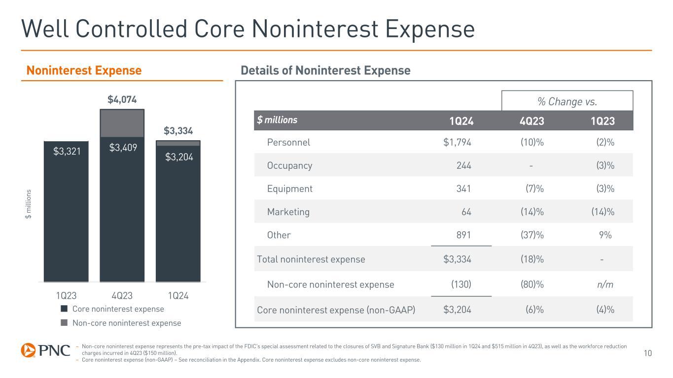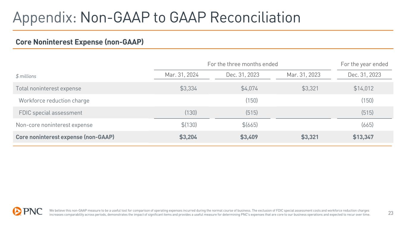 附录:Non-GAAP与GAAP的对账23我们认为,这一非GAAP衡量标准是比较正常业务过程中产生的运营费用的有用工具。将FDIC特别评估成本和减少劳动力费用排除在外增加了不同时期的可比性,证明了重大项目的影响,并为确定PNC的费用提供了有用的衡量标准,这些费用是我们业务运营的核心,预计会随着时间的推移而重复发生。截至2022年3月31日止三个月的核心非利息费用(非美国通用会计准则)2023年12月31日2023年3月31日2023年12月31日非利息费用总额3,334美元4,074美元3,321美元14,012美元裁员费用(150)(150)FDIC特别评估(130)(515)(515)非核心非利息费用(130)美元(665)(665)核心非利息费用(非美国通用会计准则)3,204美元3,409美元3,321美元13,347
