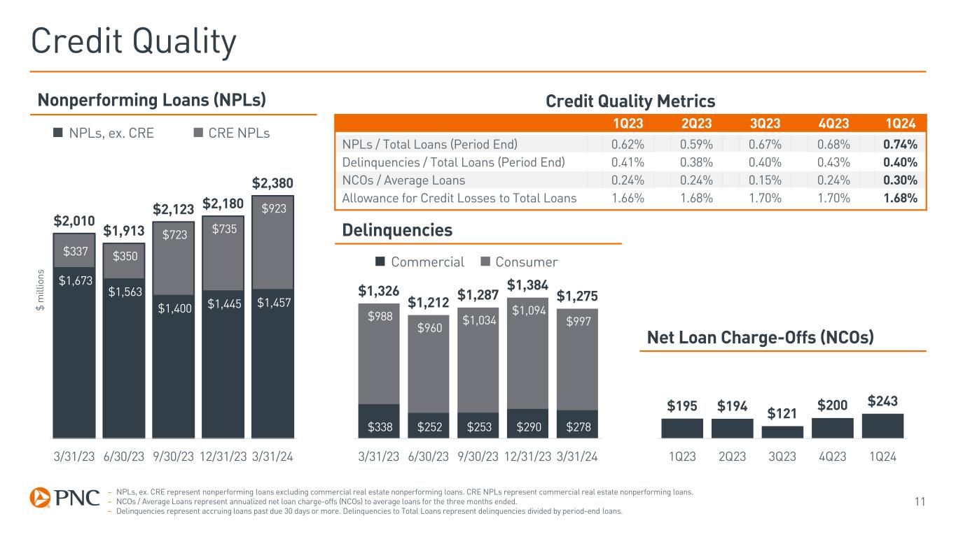 $ 200 $ 195 $ 194 $ 121 $ 243 1Q23 2Q23 3Q23 4Q23 1Q24 $ 338 $ 252 $ 253 $ 290 $ 278 $ 988 $ 960 $ 1,034 $ 1,094 $ 997 $ 1,326 $ 1,212 $ 1,287 $ 1,384 $ 1,2753/31/236/30/239/30/2312/31/233/31/2411信用质量$ 1,673 $ 1,563 $ 1,400 $ 1,445 $ 1,457 $ 337 $ 350 $ 723 $ 735 $ 923 $ 2,010 $ 1,913 $ 2,123 $ 2,180 $ 2,3803/31/236/30/239/30/2312/31/233/31/24不良贷款,ex。CRE CRE不良贷款(NPLs)商业消费者1Q23 2Q23 3Q23 4Q23 1Q24不良贷款/贷款总额(期末)0.62% 0.59% 0.67% 0.68% 0.74%拖欠/贷款总额(期末)0.41% 0.38% 0.40% 0.43% 0.40% NCO/平均贷款0.24% 0.24% 0.15% 0.24% 0.30%信贷损失准备金占贷款总额1.66% 1.68% 1.70% 1.70% 1.68%信贷质量指标拖欠净贷款冲销(NCO)–不良贷款,ex。CRE代表不包括商业地产不良贷款的不良贷款。CRE不良贷款为商业地产不良贷款。– NCO/平均贷款指截至三个月的年化净贷款冲销(NCO)与平均贷款之比。–拖欠是指逾期30天或更长时间的应计贷款。总贷款的拖欠是指拖欠除以期末贷款。$ m病io ns