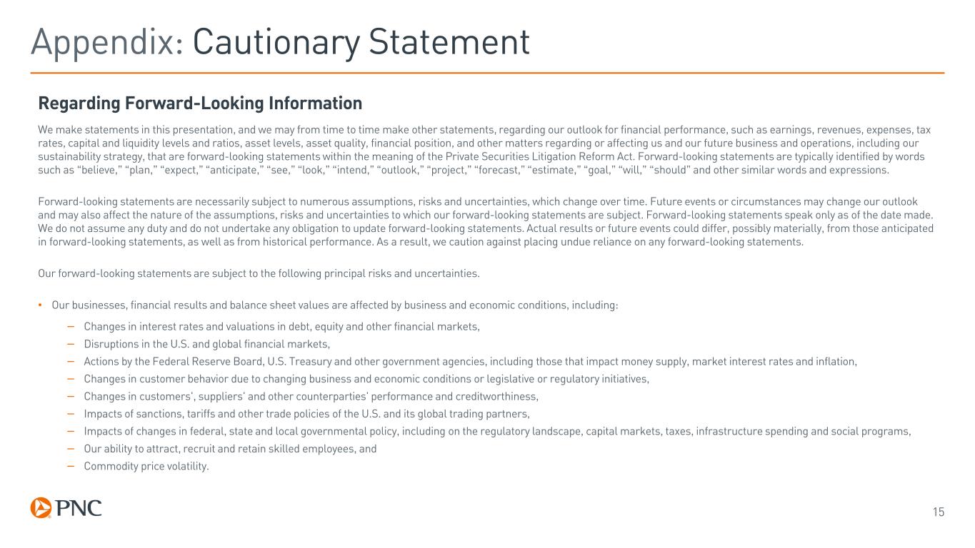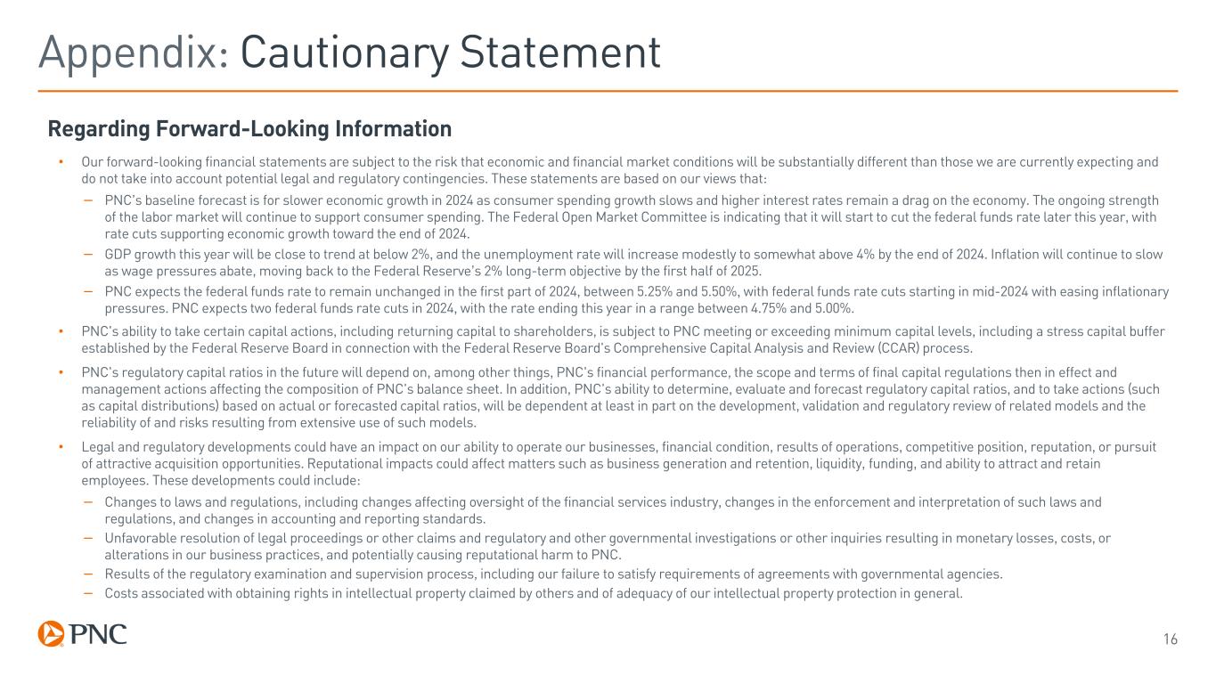 附录:警示性声明15关于前瞻性信息我们在本演示文稿中做出声明,我们可能会不时就我们的财务业绩前景做出其他声明,例如收益、收入、费用、税率、资本和流动性水平和比率、资产水平、资产质量、财务状况,以及有关或影响我们和我们未来业务和运营的其他事项,包括我们的可持续发展战略,这些都是《私人证券诉讼改革法案》含义内的前瞻性声明。前瞻性陈述通常由“相信”、“计划”、“预期”、“预期”、“看到”、“看”、“打算”、“展望”、“项目”、“预测”、“估计”、“目标”、“将”、“应该”等类似词语和表达方式来识别。前瞻性陈述必然受到众多假设、风险和不确定性的影响,这些假设、风险和不确定性会随着时间而变化。未来的事件或情况可能会改变我们的前景,也可能会影响我们的前瞻性陈述所受假设、风险和不确定性的性质。前瞻性陈述仅在作出之日起生效。我们不承担任何责任,也不承担更新前瞻性陈述的任何义务。实际结果或未来事件可能与前瞻性陈述中的预期以及历史表现存在重大差异。因此,我们告诫不要过分依赖任何前瞻性陈述。我们的前瞻性陈述受到以下主要风险和不确定性的影响。•我们的业务、财务业绩和资产负债表价值受到商业和经济状况的影响,包括:−债务、股票和其他金融市场的利率和估值变化,−美国和全球金融市场的中断,−联邦储备委员会、美国财政部和其他政府机构的行动,包括那些影响货币供应、市场利率和通货膨胀的行动,−由于不断变化的商业和经济状况或立法或监管举措而导致的客户行为变化,−客户、供应商和其他交易对手的业绩和信誉的变化,−制裁的影响,美国及其全球贸易伙伴的关税和其他贸易政策,−联邦、州和地方政府政策变化的影响,包括对监管环境、资本市场、税收、基础设施支出和社会项目的影响,−我们吸引、招聘和留住熟练员工的能力,以及−商品价格波动。