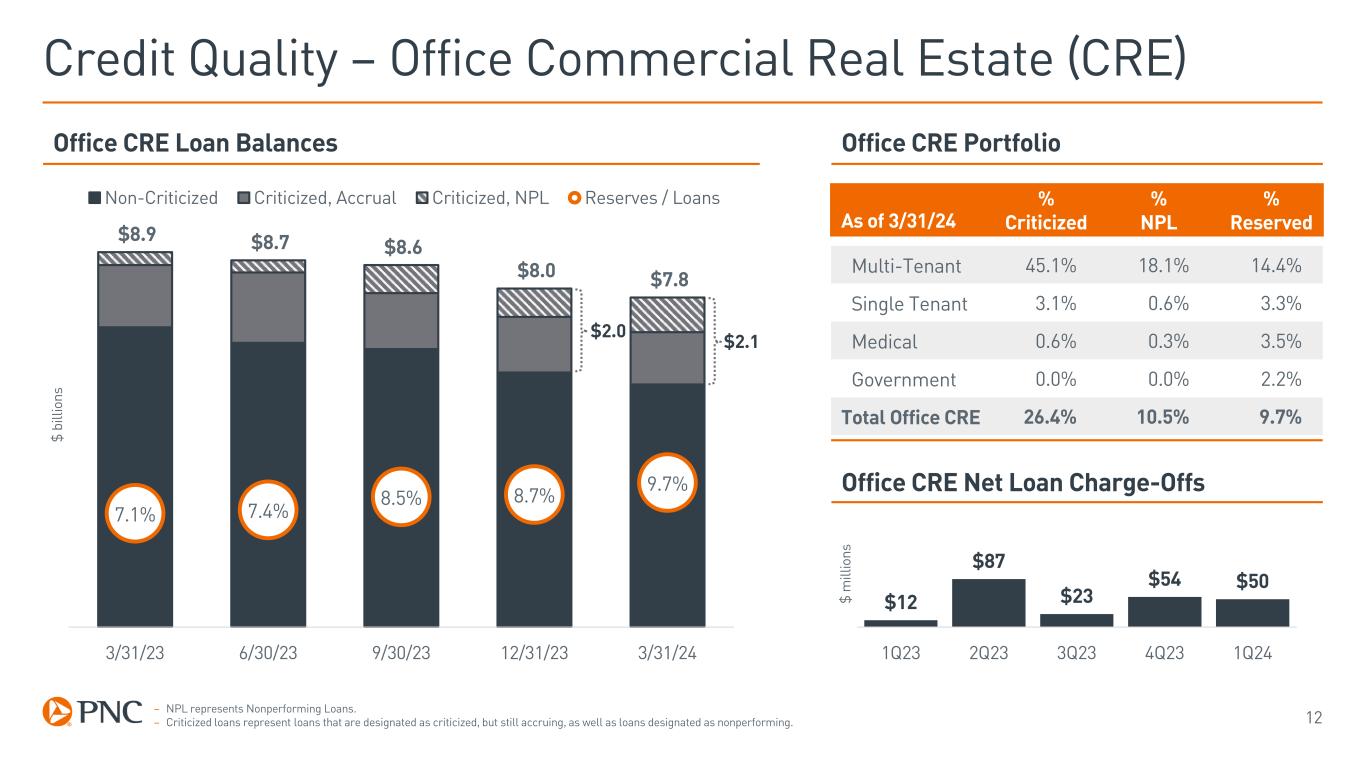 $ 12 $ 87 $ 23 $ 54 $ 50 1Q23 2Q23 3Q23 4Q23 1Q24 12信用质量–办公商业地产(CRE)$ 8.9 $ 8.7 $ 8.6 $ 8.0 $ 7.8 7.1% 7.4% 8.5% 8.7% 8.7% 9.7% 3/31/236/30/239/30/2312/31/233/31/24非批评批评批评批评,应计批评,不良准备金/贷款Office CRE贷款余额$ BILLI on s Office CRE Portfolio – NPL代表不良贷款。–受批评贷款指被指定为受批评但仍在累积的贷款,以及被指定为不良贷款。截至3/31/24%批评%不良率%预留多租户45.1% 18.1% 14.4%单租户3.1% 0.6% 3.3%医疗0.6% 0.3% 3.5%政府0.0% 0.0% 2.2%总办公室CRE 26.4% 10.5% 9.7%办公室CRE净贷款冲销$ m病io ns $ 2.0$ 2.1