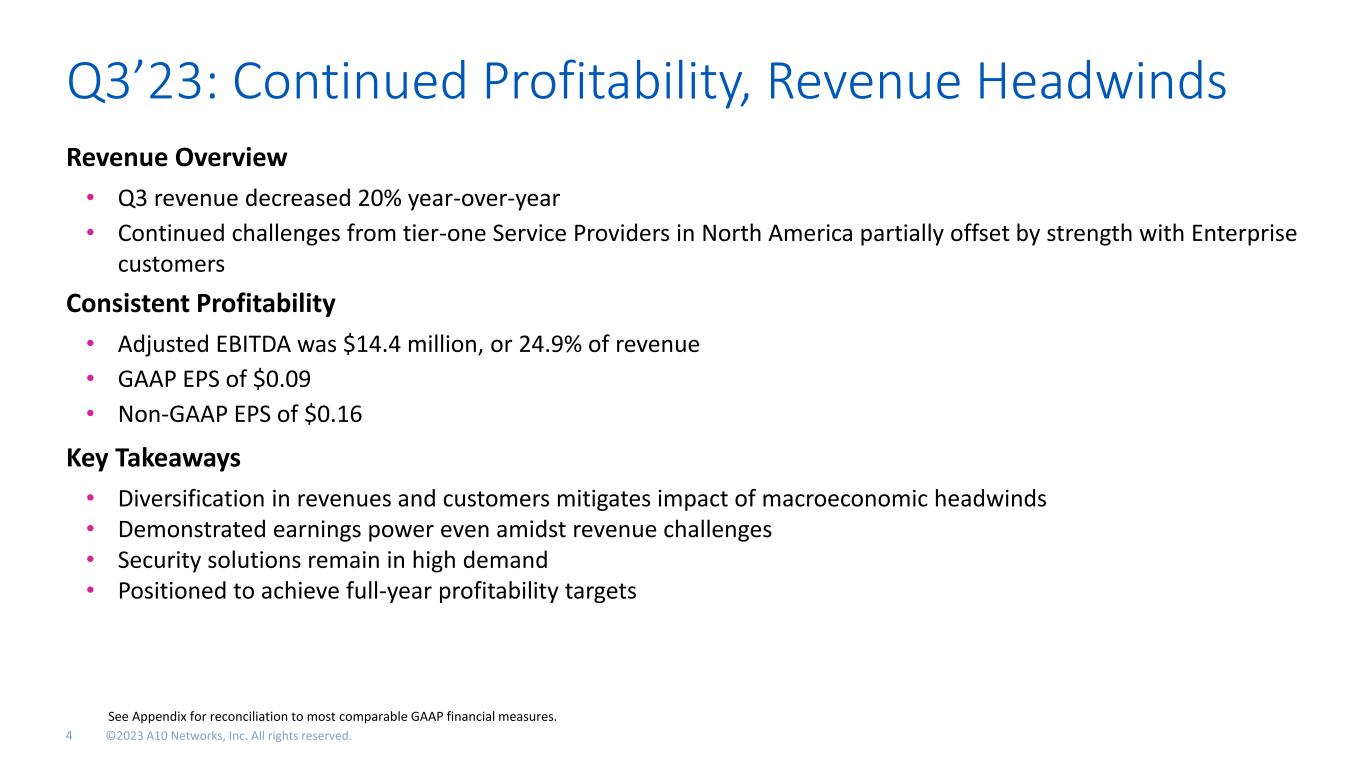23年第三季度:持续盈利,收入逆风收入概览•第三季度收入同比下降20% •北美一级服务提供商的持续挑战被企业客户的优势部分抵消持续盈利能力•调整后EBITDA为1440万美元,占收入的24.9% • GAAP每股收益为0.09美元•非GAAP每股收益为0.16美元关键要点•收入和客户的多样化减轻了宏观经济逆风的影响•即使在收入挑战中也显示出盈利能力•安全解决方案的需求仍然很高•能够实现全年盈利目标与大多数可比GAAP财务指标的对账见附录。