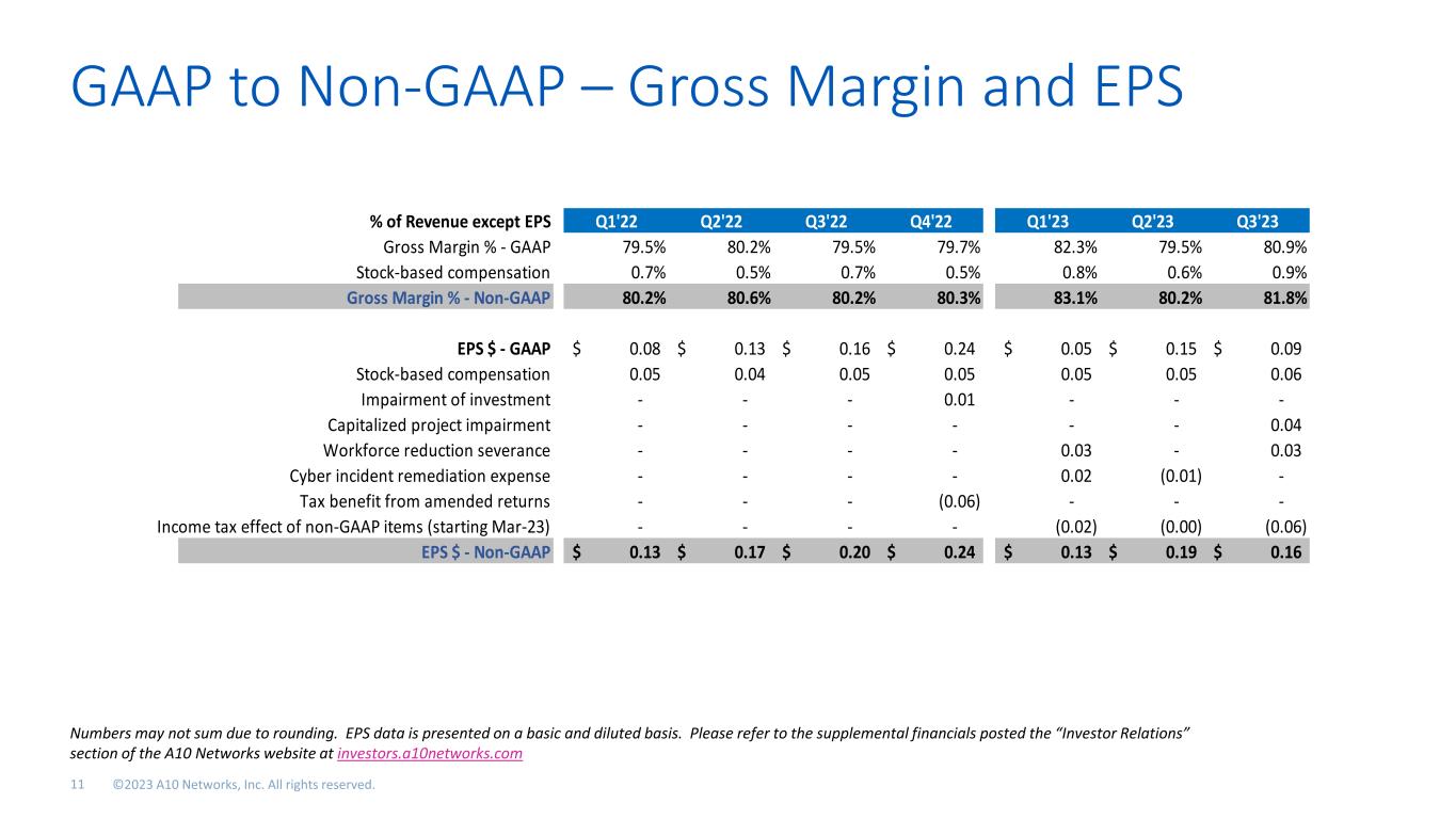 GAAP到Non-GAAP ——由于四舍五入,毛利率和每股收益数字可能不相加。每股收益数据是在基本和稀释的基础上提出的。请参阅A10 Networks网站Investors.a10networks.com上“投资者关系”部分发布的补充财务资料。占收入的百分比除EPS Q1‘22 Q2’22 Q3‘22 Q4’22 Q1‘23 Q2’23 Q3'23毛利率%-GAAP 79.5% 80.2% 79.5% 79.5% 79.7% 82.3% 79.5% 80.9%基于股票的薪酬0.7% 0.5% 0.7% 0.5% 0.8% 0.6% 0.9%毛利率%-非GAAP 80.2% 80.6% 80.2% 80.3% 83.1% 80.2% 81.8% EPS $-GAAP 0.08 $ 0.13 $ 0.16 $ 0.24 $ 0.24 $ 0.05 $ 0.15 $ 0.09 $基于股票的薪酬0.05 0.04 0.05 0.05 0.05 0.05 0.06投资减值---0.01--资本化项目减值-----0.04裁员遣散费----0.03-0.03网络事故补救费用----0.02(0.01)-修正申报表的税收优惠---(0.06)---非GAAP项目的所得税影响(从3月23日开始)----(0.02)(0.00)(0.06)EPS $-非GAAP 0.13 $ 0.17 $ 0.20 $ 0.24 $ 0.13 $ 0.19 $ 0.16 $