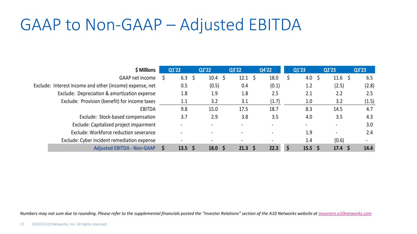 GAAP到Non-GAAP –由于四舍五入,调整后的EBITDA数字可能不相加。请参阅A10 Networks网站Investors.a10networks.com上“投资者关系”部分发布的补充财务资料。百万美元Q1‘22 Q2’22 Q3‘22 Q4’22 Q1‘23 Q2’23 Q3 ' 23 GAAP净利润6.3 $ 10.4 $ 12.1 $ 18.0 $ 4.0 $ 11.6 $ 6.5 $不包括:利息收入和其他(收入)费用,净额0.5(0.5)0.4(0.1)1.2(2.5)(2.8)不包括:折旧和摊销费用1.8 1.9 1.8 2.5 2.1 2.2 2.5不包括:所得税拨备(收益)1.13.2 3.1(1.7)1.0 3.2(1.5)EBITDA 9.815.01 7.5 18.78.31 4.5 4.7不包括:股票薪酬3.7 2.9 3.8 3.54.0 3.5 4.3不包括:资本化项目减值-----3.0不包括:裁员遣散费----1.9-2.4不包括:网络事故补救费用----1.4(0.6)-调整后EBITDA-非公认会计原则13.5美元18.0美元21.3美元22.3美元15.5美元17.4美元14.4美元