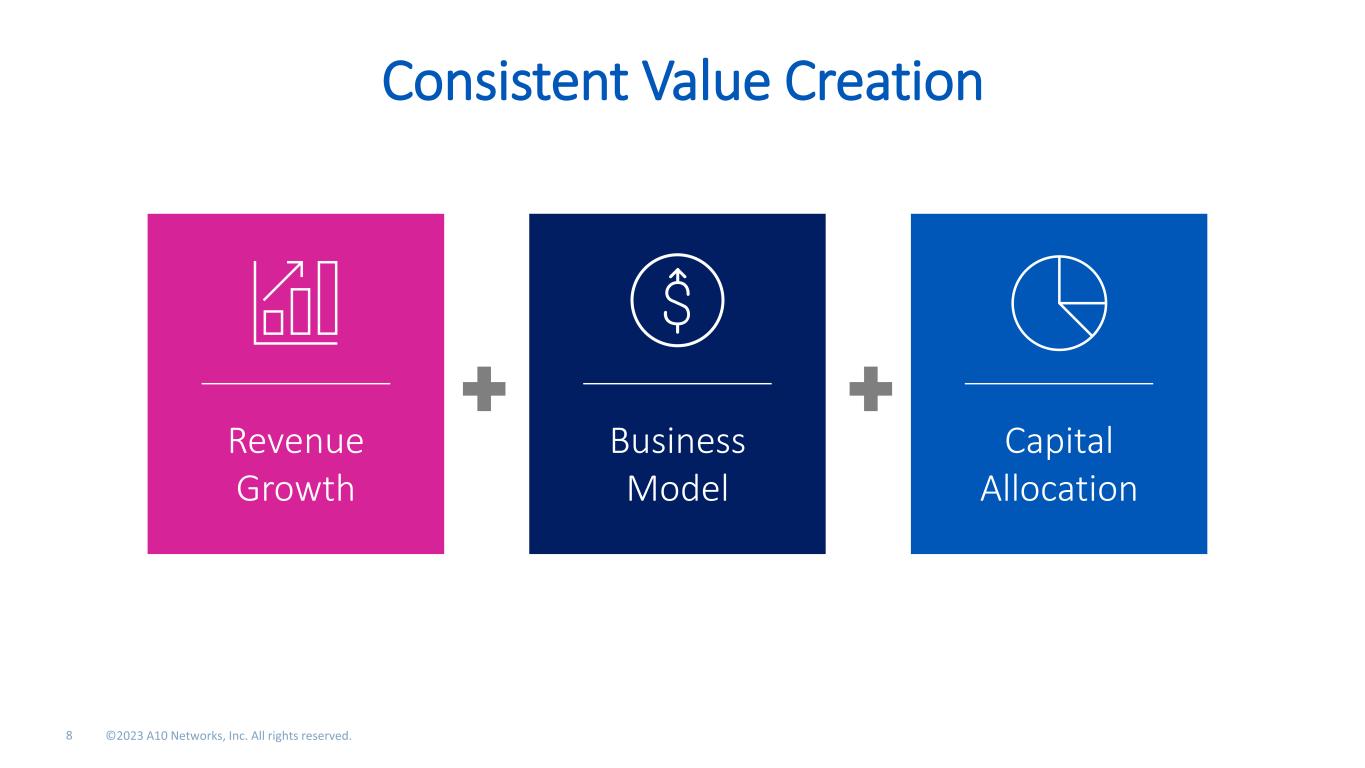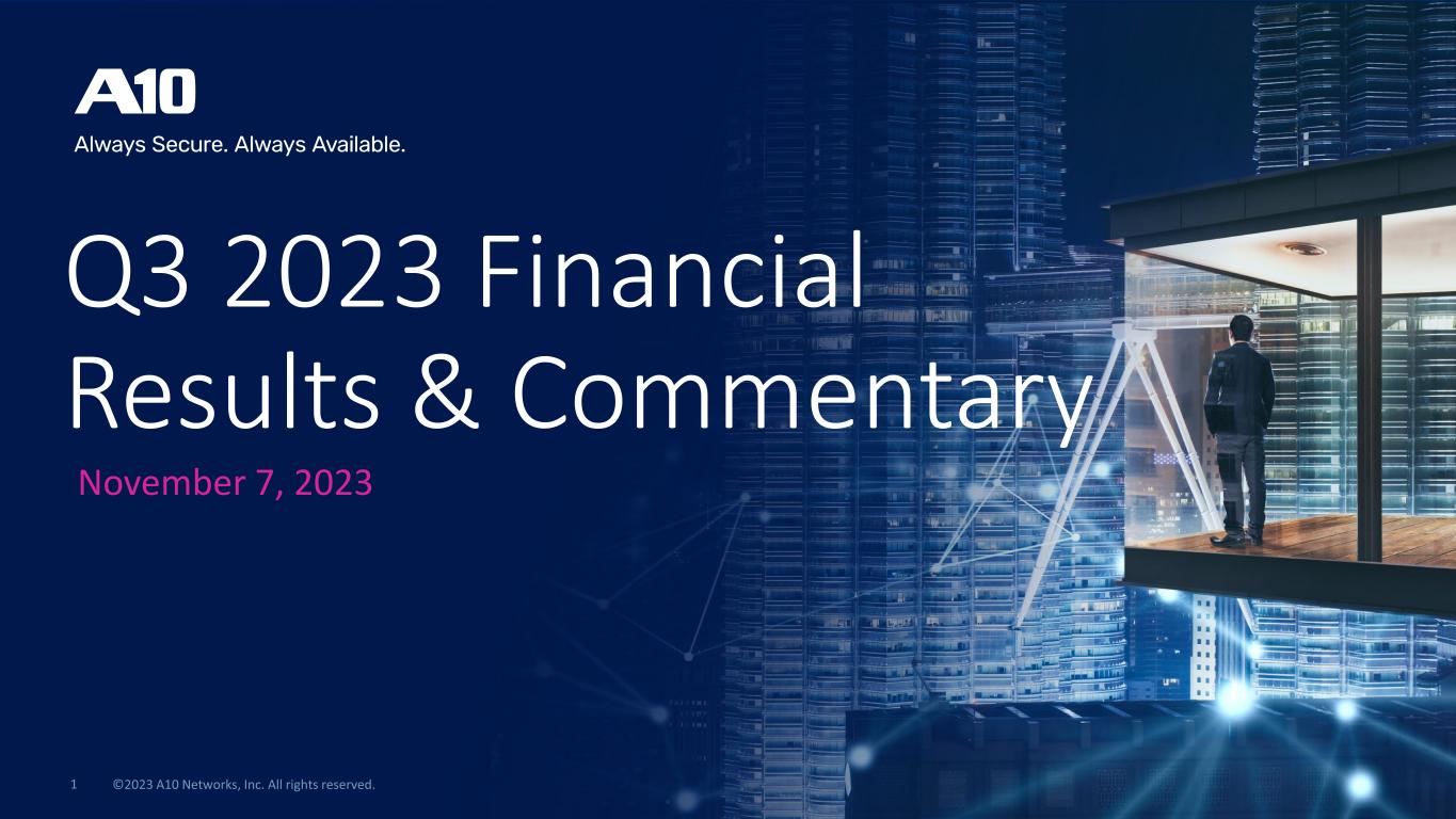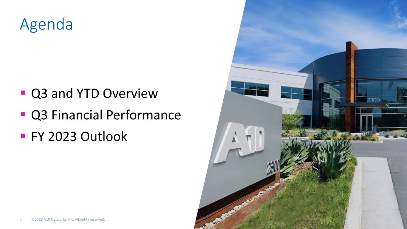 警示性声明和披露本演示文稿及随附的口头演示文稿包含基于我们管理层的信念和假设的“前瞻性”陈述,包括关于我们未来财务业绩、战略、市场路线、技术差异化、定位、资本配置战略、扩张机会、增长、盈利能力、市场增长以及市场和技术趋势的陈述。前瞻性陈述受到已知和未知风险和不确定性的影响,其依据是可能被证明不正确的假设,这些假设可能导致实际结果与前瞻性陈述的预期或暗示存在重大差异。可能导致实际结果不同的因素包括对资本的任何意外需求,这可能要求我们将本可用于股息计划或股票回购计划的资金转移出去,这可能反过来对我们管理季度股息或回购普通股的能力产生负面影响;全球宏观经济或政治状况的显著下降对我们的业务和财务业绩产生负面影响;与我们的供应链有关的业务中断;我们管理业务和费用的能力如果客户取消或延迟订单;与完成关键交易和改进我们的执行有关的执行风险;我们的产品继续被市场采用;我们成功预测市场需求和机会的能力;我们及时开发新产品和功能;我们实现或保持盈利的能力;我们最大的最终客户预期采购的任何损失或延迟;我们维持或提高竞争地位的能力;与云计算趋势相关的竞争和执行风险;我们吸引和留住新的最终客户和我们最大的最终消费者的能力;我们维持和提升品牌的能力和声誉;客户对我们产品的部署和支付模式的要求变化;网络安全相关市场的持续增长;未来对互补性公司和产品的任何收购或投资的成功,服务或技术;我们的销售团队执行良好的能力;我们缩短紧密周期的能力;我们的渠道合作伙伴销售我们的产品的能力;产品组合或销售地理位置的变化;与我们在国际市场的存在相关的风险;我们对财务报告的内部控制的弱点或缺陷;我们及时提交根据1934年《证券交易法》要求提交的定期报告的能力;以及我们向美国证券交易委员会提交的定期文件中“风险因素”中描述的其他风险,包括我们于2023年2月27日向美国证券交易委员会提交的10-K表格。我们不打算更新或更改我们的前瞻性陈述,无论是由于新信息、未来事件或其他原因,除非适用法律要求。本演示文稿和随附的口头演示文稿还包括某些非GAAP财务指标,包括非GAAP毛利率、非GAAP营业收入、非GAAP净利润、非GAAP营业利润率、调整后EBITDA和非GAAP每股收益。非GAAP财务指标没有任何标准化的含义,因此不太可能与其他公司提出的类似的标题指标进行比较。A10 Networks认为这些非公认会计原则的财务指标很重要,因为它们提供了衡量公司经营业绩的有用指标,不包括不直接影响我们所认为的核心经营业绩的不寻常事件或因素,公司管理层为此目的使用了这些指标。非GAAP财务指标不应与根据GAAP编制的财务信息隔离或替代。我们将非GAAP净收入定义为我们的GAAP净收入,不包括:(i)基于股票的薪酬和相关的工资税,(ii)减值费用,(iii)网络事件补救费用,(iv)裁员费用和(v)不包括上述(i)至(iv)项的所得税影响。我们将非GAAP每股基本和稀释后的净利润定义为我们的非GAAP净利润除以我们的基本和稀释加权平均流通股。我们将非GAAP毛利润定义为我们的GAAP毛利润,不包括(i)基于股票的薪酬和相关的工资税,(ii)网络事件补救费用和(iii)裁员费用。我们将非GAAP毛利率定义为我们的非GAAP毛利除以我们的GAAP收入。我们将非GAAP营业收入定义为我们的GAAP营业收入,不包括(i)基于股票的薪酬和相关的工资税,(ii)减值费用, (三)网络事故补救费用和(四)裁员费用。我们将非GAAP营业利润率定义为我们的非GAAP营业收入除以我们的GAAP收入。我们将非GAAP运营费用定义为我们的GAAP运营费用,不包括(i)基于股票的薪酬和相关的工资税,(ii)减值费用,(iii)网络事件补救费用和(iv)裁员费用。我们将调整后EBITDA定义为我们的GAAP净收入,不包括(i)利息和其他(收入)费用,净额,(ii)折旧和摊销费用,(iii)所得税准备金,(iv)基于股票的薪酬和相关的工资税,(v)减值费用,(vi)裁员费用和(vii)网络事件补救费用。我们将调整后EBITDA利润率定义为我们的调整后EBITDA除以我们的GAAP收入。GAAP和非GAAP财务指标之间的对账可以在本文件的附录和随附的财务业绩新闻稿中找到。