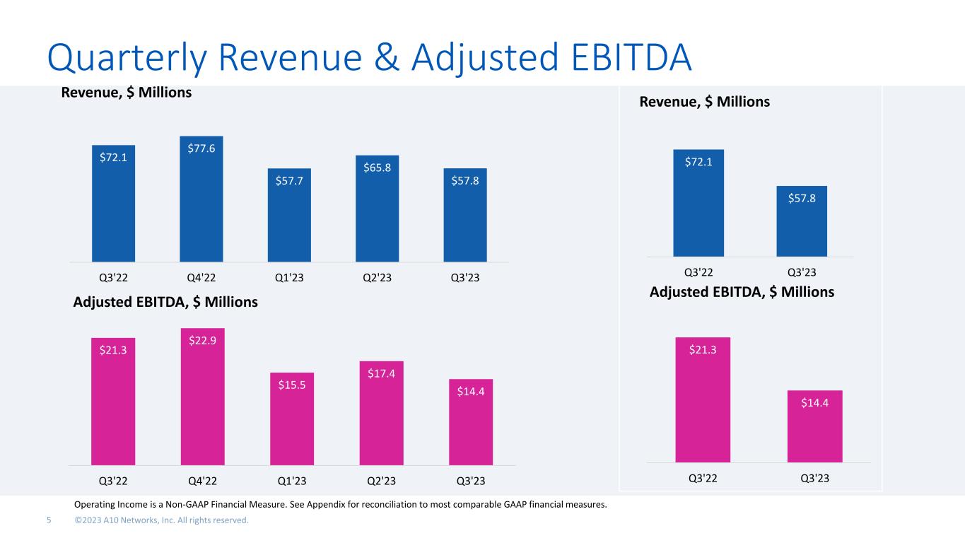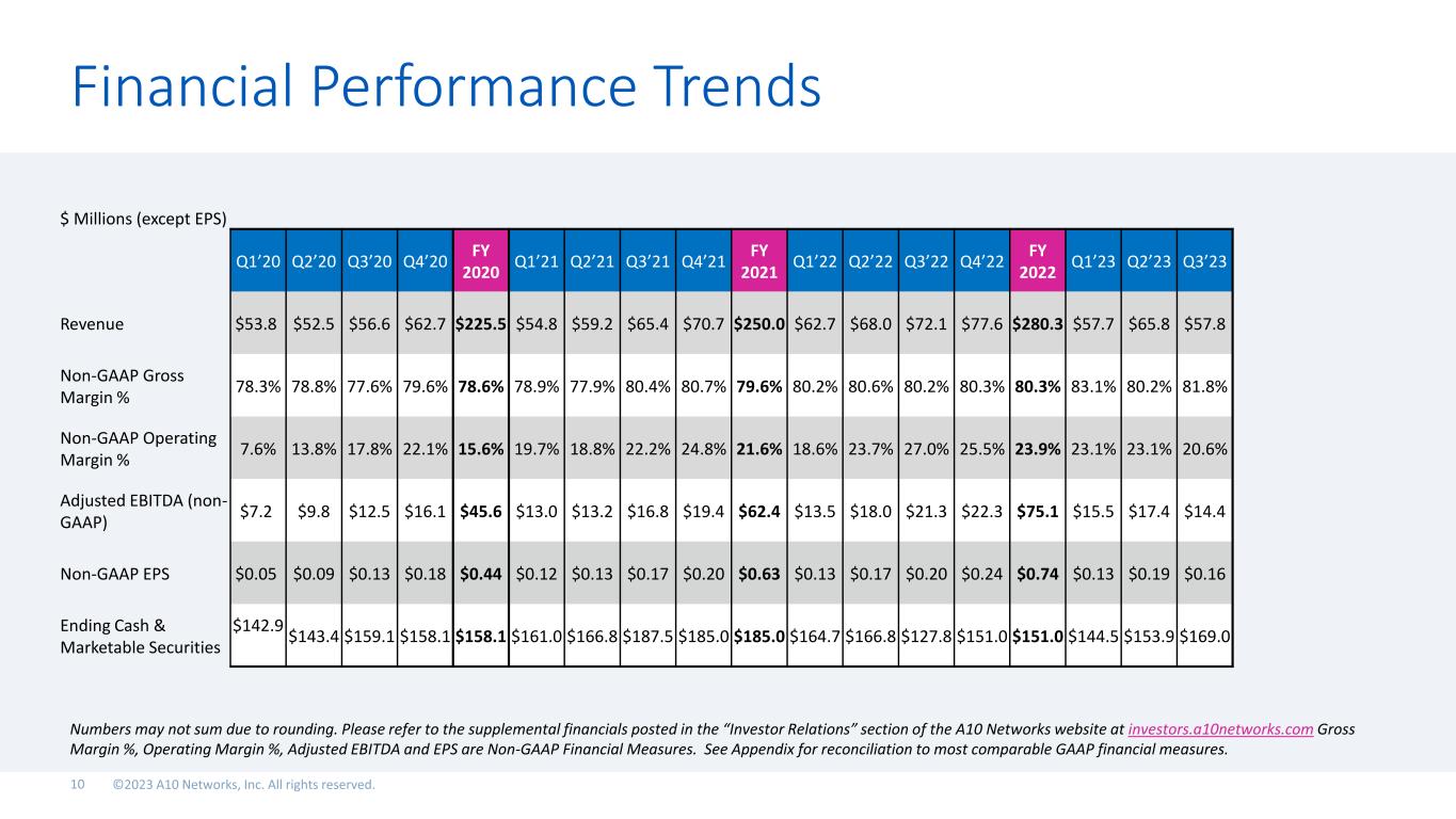 由于四舍五入,财务业绩趋势数字可能不相加。请参阅A10 Networks网站Investors.a10networks.com的“投资者关系”部分发布的补充财务数据。毛利率%、营业利润率%、调整后EBITDA和每股收益均为非公认会计准则财务指标。与大多数可比的GAAP财务指标的对账见附录。百万美元(除EPS)Q1‘20 Q2’20 Q3‘20 Q4’20 FY 2020 Q1‘21 Q2’21 Q3‘21 Q4’21 FY 2021 Q1‘22 Q2’22 Q3‘22 Q4’22 FY 2022 Q1‘23 Q2’23 Q3 ' 23 Revenue $ 53.8 $ 52.5 $ 56.6 $ 62.7 $ 225.5 $ 54.8 $ 59.2 $ 65.4 $ 70.7 $ 250.0 $ 62.7 $ 68.0 $ 72.1 $ 77.6 $ 280.3 $ 57.7 $ 65.8 $ 57.8 Non-GAAP Gross Margin % 78.3% 78.8% 77.6% 79.6% 78.6% 78.9% 77.9% 80.4% 80.7% 79.6% 80.2% 80.6% 80.2% 80.3% 80.3% 83.1% 80.2% 81.8% Non-GAAP Operating Margin % 7.6% 13.8% 17.8% 22.1% 15.6% 19.716.8美元19.4美元62.4美元13.5美元18.0美元21.3美元22.3美元75.1美元15.5美元17.4美元14.4美元非GAAP每股收益0.05美元0.09美元0.13美元0.18美元0.44美元0.12美元0.13美元0.17美元0.20美元0.63美元0.13美元0.17美元0.20美元0.24美元0.74美元0.13美元0.19美元0.16美元期末现金和有价证券142.9美元143.4美元159.1美元158.1美元158.1美元161.0美元166.8美元187.5美元185.0美元185.0美元164.7美元166.8美元127.8美元151.0美元151.0美元144.5美元153.9美元169.0美元