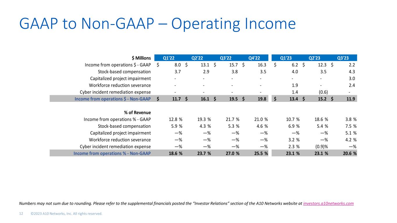 GAAP与Non-GAAP ——由于四舍五入,营业收入数字可能不相加。请参阅A10 Networks网站Investors.a10networks.com上“投资者关系”部分发布的补充财务资料。百万美元Q1‘22 Q2’22 Q3‘22 Q4’22 Q1‘23 Q2’22 Q2‘23 Q3’23运营收入$-GAAP 8.0 $ 13.1 $ 15.7 $ 16.3 $ 6.2 $ 12.3 $ 2.2 $股票薪酬3.7 2.9 3.8 3.54.0 3.5 4.3资本化项目减值-----3.0裁员遣散费----1.9-2.4网络事故补救费用----1.4(0.6)-运营收入$-非美国通用会计准则11.7 $ 16.1 $ 19.5 $ 19.8 $ 13.4 $ 15.2 $ 11.9 $ 11.9 $ % of Revenue Income from Operations %-GAAP 12.8% 19.3% 21.7% 21.7% 10.7% 18.6% 3.8% Stock-based补偿5.9% 4.3% 5.3% 4.6% 6.9% 5.4% 7.5%资本化项目减值——% ——% ——% ——% ——% 5.1%裁员遣散费——% ——% ——% 3.2% ——% 4.2%网络事故补救费用——% ——% ——% 2.3%(0.9)%—%营业收入%-非公认会计原则18.6% 23.7% 27.0% 25.5% 23.1% 23.1% 20.6%