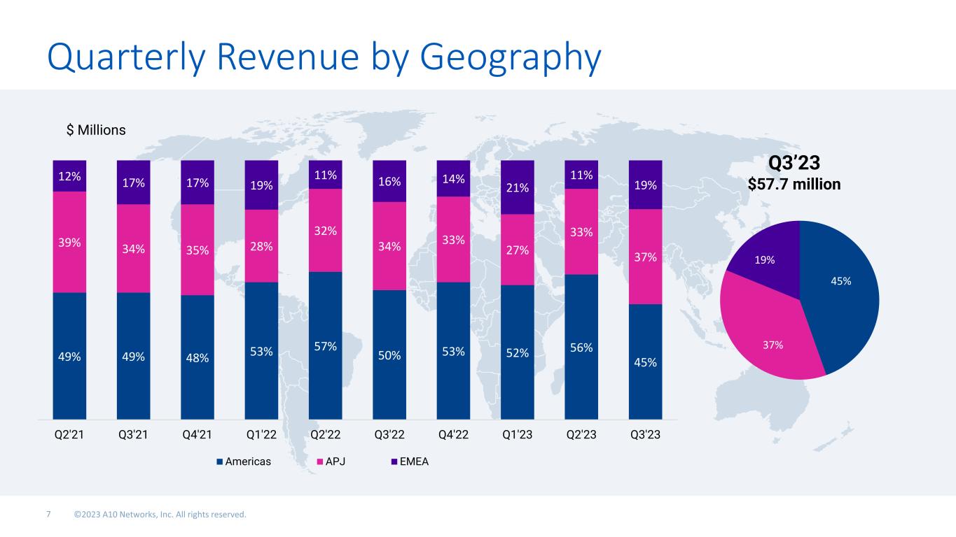 按地区划分的季度收入49% 49% 48% 53% 57% 50% 53% 52% 56% 45% 39% 34% 35% 28% 32% 34% 33% 27% 33% 37% 12% 17% 17% 19% 11% 16% 14% 21% 11% 19% Q2‘21 Q3’21 Q4‘21 Q1’22 Q2‘22 Q3’22 Q4‘22 Q1’23 Q2‘23 Q3’23 $ Millions Americas APJ EMEA 45% 37% 19% Q3 ' 23 $ 5770万
