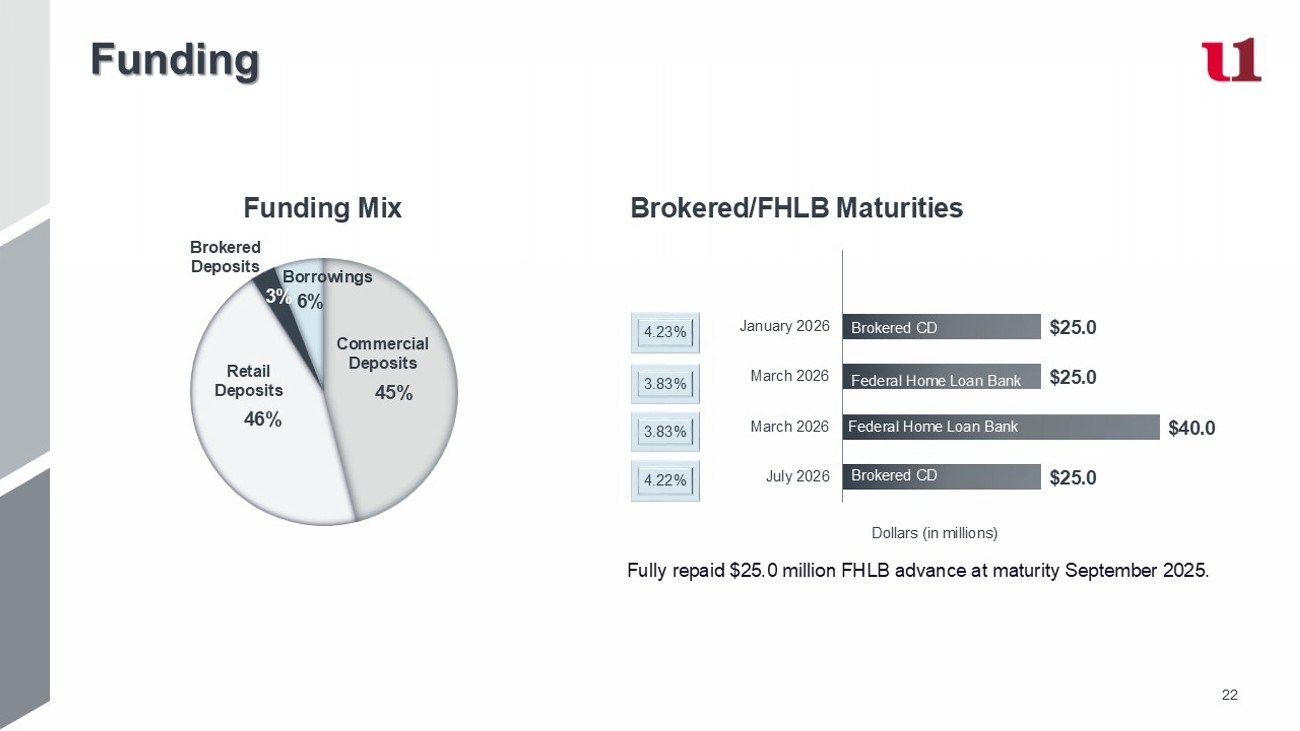 22融资45% 46% 3% 6%经纪存款商业存款零售存款借款资金混合经纪/FHLB到期$ 25.0 $ 40.0 $ 25.0 $ 25.0 2026年7月2026年3月2026年3月2026年1月美元(百万)FHLB Advance Federal Home Loan Bank Brokered CD 4.23% Brokered CD 4.22% 3.83% Brokered CD Federal Home Loan Bank 3.83%在2025年9月到期时全额偿还了25.0百万美元的FHLB预付款。