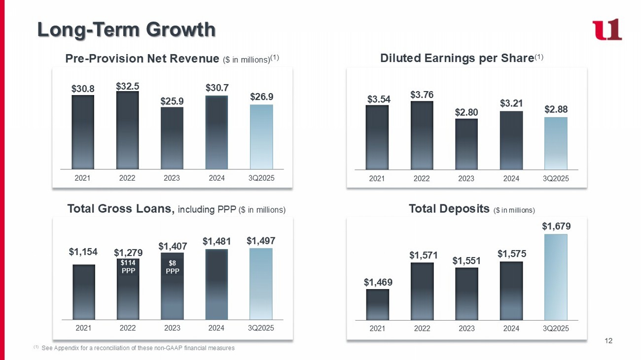 11 $ 1870万净收入(1)$ 2.88摊薄后EPS(1)1.24%*ROAA(1)14.09*ROATCE(1)3.64% NIM年初至今财务摘要▪与2024年12月31日相比,总资产增加了51.0万美元▪2025年前9个月的合并净收入(1)为1870万美元,而2024年前9个月为1480万美元;拨备前净收入分别为2690万美元和2210万美元▪净利息收入,按非公认会计准则,FTE基础*与2024年前9个月相比,2025年前9个月增加了580万美元,原因是利息收入增加和利息支出稳定▪资产质量保持稳定,信贷损失准备金(“ACL”)与未偿还贷款的比率在2025年9月30日为1.28%,在2025年6月30日为1.27%▪2025年前9个月的效率比率为58.73%(1),而2024年前9个月的效率比率为63.47%;比率改善主要归因于净利息收入增加,非利息收入增加,被增加的非利息费用略微抵消(1)这些非公认会计原则财务指标的调节见附录*2025年第三季度年化
