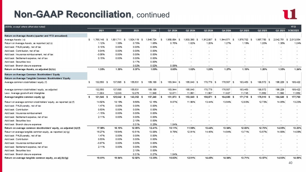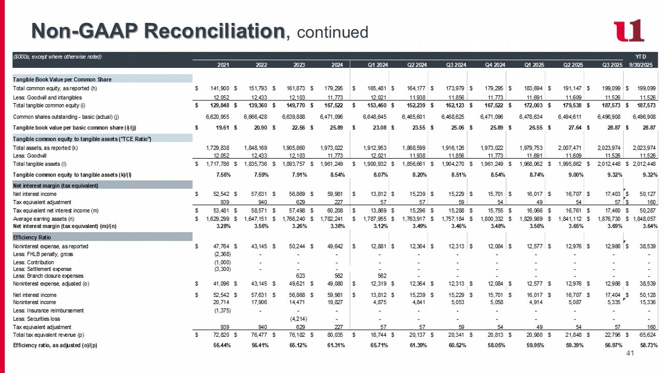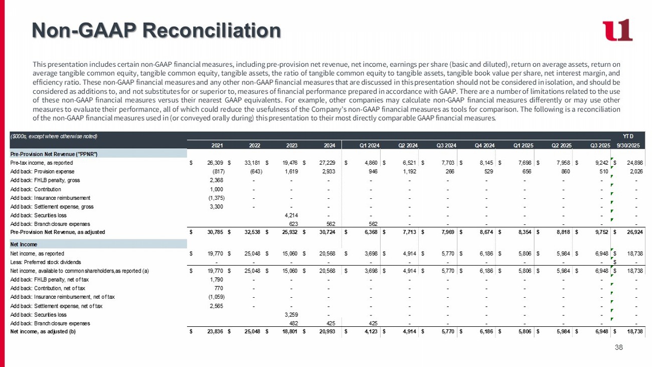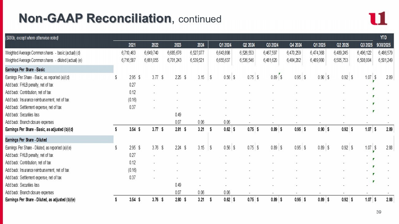 38本演示文稿包括某些非公认会计准则财务指标,包括拨备前净收入、净收入、每股收益(基本和稀释)、平均资产回报率、平均有形普通股权益回报率、有形普通股权益、有形资产、有形普通股权益与有形资产的比率、每股有形账面价值、净息差和效率比率。本演示文稿中讨论的这些非GAAP财务指标和任何其他非GAAP财务指标不应被孤立地考虑,应被视为对根据GAAP编制的财务业绩指标的补充,而不是替代或优于这些指标。使用这些非GAAP财务指标与最接近的GAAP等值指标相比存在许多限制。例如,其他公司可能会以不同的方式计算非GAAP财务指标,或者可能会使用其他指标来评估其业绩,所有这些都可能降低公司非GAAP财务指标作为比较工具的有用性。以下是本演示文稿中使用(或在此期间口头传达的)非GAAP财务指标与其最直接可比的GAAP财务指标的对账。非公认会计原则调节(000美元,除非另有说明)年初至今2021202220232024 Q1 2024 Q2 2024 Q3 2024 Q4 2024 Q1 2025 Q2 2025 Q3 20259/30/2025拨备前净收入(“PPNR”)税前收入,如报告的26,309美元33,181美元19,476美元27,229美元4,860美元6,521美元7,703美元8,145美元7,698美元7,958美元9,242美元24,898美元加回:拨备费用(817)(643)1,6192,9339461,1922665296568605102,026加回:FHLB罚款,毛额2,368------------加回:缴款1,000-----------加回:保险报销(1,375)-----------加回:结算费用,毛额3,300-----------加回:证券损失4,214--------加回:分支机构关闭费用623562562--------拨备前净营收,经调整后的30,785美元32,538美元25,932美元30,724美元6,368美元7,713美元7,969美元8,674美元8,354美元8,818美元9,752美元26,924美元净收入,报告19,770美元25,048美元15,060美元20,568美元3,698美元4,914美元5,770美元6,186美元5,806美元5,806美元5,984美元6,948美元18,738美元减:优先股股息------------------------------------------------------------税后净额770-----------加回:保险报销,税后净额(1,059)----------加回:结算费用,税后净额2,565----------加回:证券损失3,259---------加回:分支机构关闭费用482425425----------调整后净收入(b)23,836美元25,048美元18,801美元20,993美元4,123美元4,914美元5,770美元6,186美元5,806美元5,984美元6,948美元18,738美元