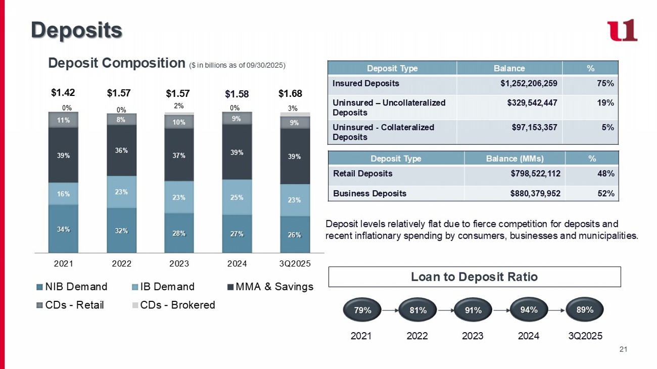 21存款34% 32% 28% 27% 26% 16% 23% 23% 25% 23% 39% 36% 37% 39% 11% 8% 10% 9% 9% 0% 0% 2% 0% 3% 2021202220232024 3Q2025 NIB Demand IB Demand MMA & Savings CDs-Retail CDs-Brokered $ 1.57 $ 1.42 $ 1.68 $ 1.57 $ 1.58存款构成(截至09/30/2025以十亿美元计)79% 81% 91% 94% 89%贷存比2021202220232024 3Q2025由于存款竞争激烈以及消费者、企业和市政当局最近的通货膨胀支出,存款水平相对持平。%余额存款类型75% $ 1,252,206,259有保险存款19% $ 329,542,447无保险–无抵押存款5% $ 97,153,357无保险-抵押存款%余额(MMS)存款类型48% $ 798,522,112零售存款52% $ 880,379,952商业存款
