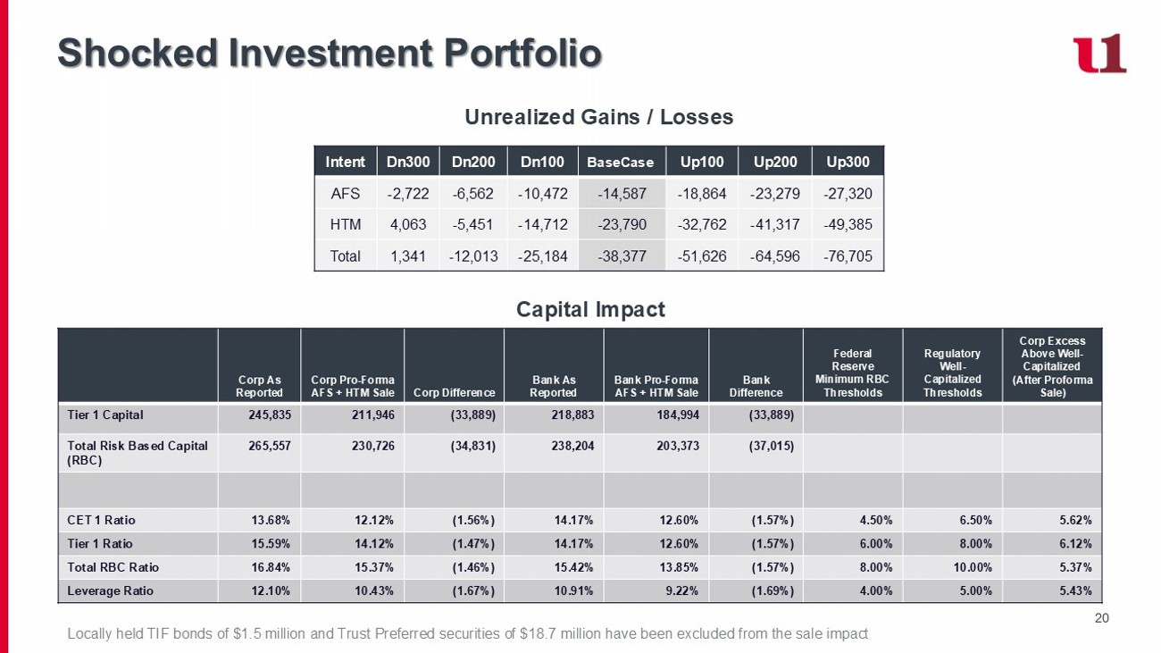 20震惊的投资组合未实现收益/损失资本影响UP300 UP200 UP100 BaseCase DN100 DN200 DN300意向-27,320-23,279-18,864-14,587-10,472-6,562-2,722 AFS-49,385-41,317-32,762-23,790-14,712-5,4514,063 HTM-76,705-64,596-51,626-38,377-25,184-12,0131,341公司超额总额高于-资本化(在形式出售后)监管资本充足的门槛美联储最低RBC门槛银行差额银行备考AFS + HTM销售银行作为报告的Corp Difference Corp备考AFS+ HTM Sale Corp as Reported(33,889)184,994218,883(33,889)211,946245,835一级资本(37,015)203,373238,204(34,831)230,726265,557总风险基础资本(RBC)5.62% 6.50% 4.50%(1.57%)12.60% 14.17%(1.56%)12.12% 13.68% CET 1比6.12% 8.00% 6.00%(1.57%)12.60% 14.17%(1.47%)14.12% 15.59%一级比率5.37% 10.00% 8.00%(1.57%)13.85% 15.42%(1.46%)15.37% 16.84%总RBC比率5.43% 5.00% 4.00%(1.69%)9.22% 10.22