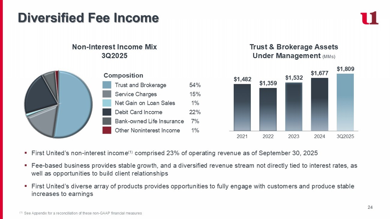 24多元化的费用收入(1)这些非GAAP财务指标构成的对账见附录54%信托和经纪业务15%服务收费1%贷款销售净收益22%借记卡收入7%银行自有人寿保险1%其他非利息收入非利息收入混合2025年第三季度信托和经纪业务管理资产(MMS)▪截至2025年9月30日,马里兰第一联合的非利息收入(1)占营业收入的23%▪收费型业务提供稳定增长,不直接与利率挂钩的多元化收入流,以及建立客户关系的机会▪马里兰第一联合多样化的产品系列提供了与客户充分互动并稳定增加收益的机会$ 1,482 $ 1,359 $ 1,532 $ 1,677 $ 1,8092021202220232024 3Q2025