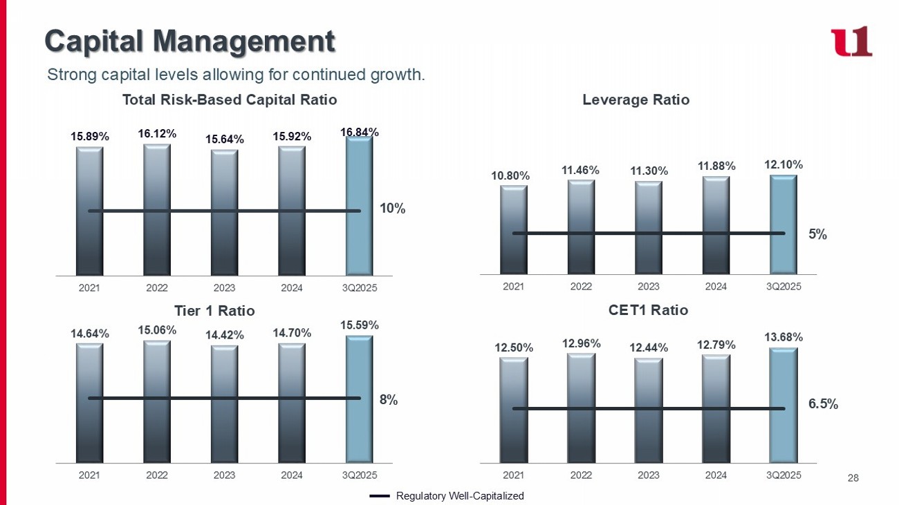 27利率风险(一)标准模型假设利率风险敏感性▪该行利率风险头寸在三种利率爬坡情景下进行压力测试,以确定动态和静态资产负债表条件下对净利息收入、净收入和资本的影响。▪该行的净利息收入状况处于略微资产敏感的状况。▪从利率风险角度来看,该行最大的风险是利率下降情景,但定位为中性。▪每季度审查和调整有关发行利率、贷款和投资提前还款速度、贝塔和衰减率的假设。管理层展望与策略▪有纪律的贷款定价▪根据关系和例外情况管理存款定价▪为商家通过短期CD促销和可调利率货币市场产品存款获取,市政当局和消费者▪主动降低存款利率与市场调整同步进行▪另类融资到期日o 2026年1月到期的2500万美元经纪CD o 2026年3月到期的2500万美元FHLB预付款o 2026年3月到期的4000万美元FHLB预付款o 2026年7月到期的2500万美元经纪CD + 400 + 300 + 200 + 100平-100-200-300-4008.2% 7.8% 6.3% 3.6%(4.3%)(8.3%)(12.7%)(17.8%)净利息收入(09/30/25)9.0% 8.3% 6.7% 3.7%(4.5%)(8.3%)(12.6%)(17.8%)净利息收入(06/30/25)(19.2%)(12.8%)(7.3%)(2.8%)0.8%(1.2%)(6.0%)(13.5%)EVE(06/30/25)12个月