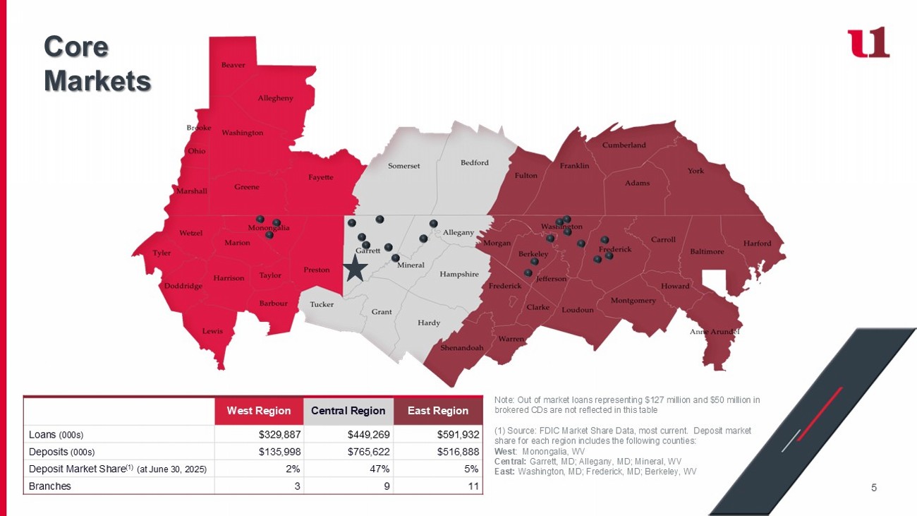 东部地区中部地区西部地区$ 591,932 $ 449,269 $ 329,887贷款(000s)$ 516,888 $ 765,622 $ 135,998存款(000s)5% 47% 2%存款市场份额(1)(截至2025年6月30日)1193分行注:代表1.27亿美元的市场外贷款和5000万美元的经纪CD未反映在本表中(1)资料来源:FDIC市场份额数据,最新。每个地区的矿床市场份额包括以下县:西部:Monongalia,WV Central:Garrett,MD;Allegany,MD;Mineral,WV East:Washington,MD;Frederick,MD;Berkeley,WV Core Markets 5