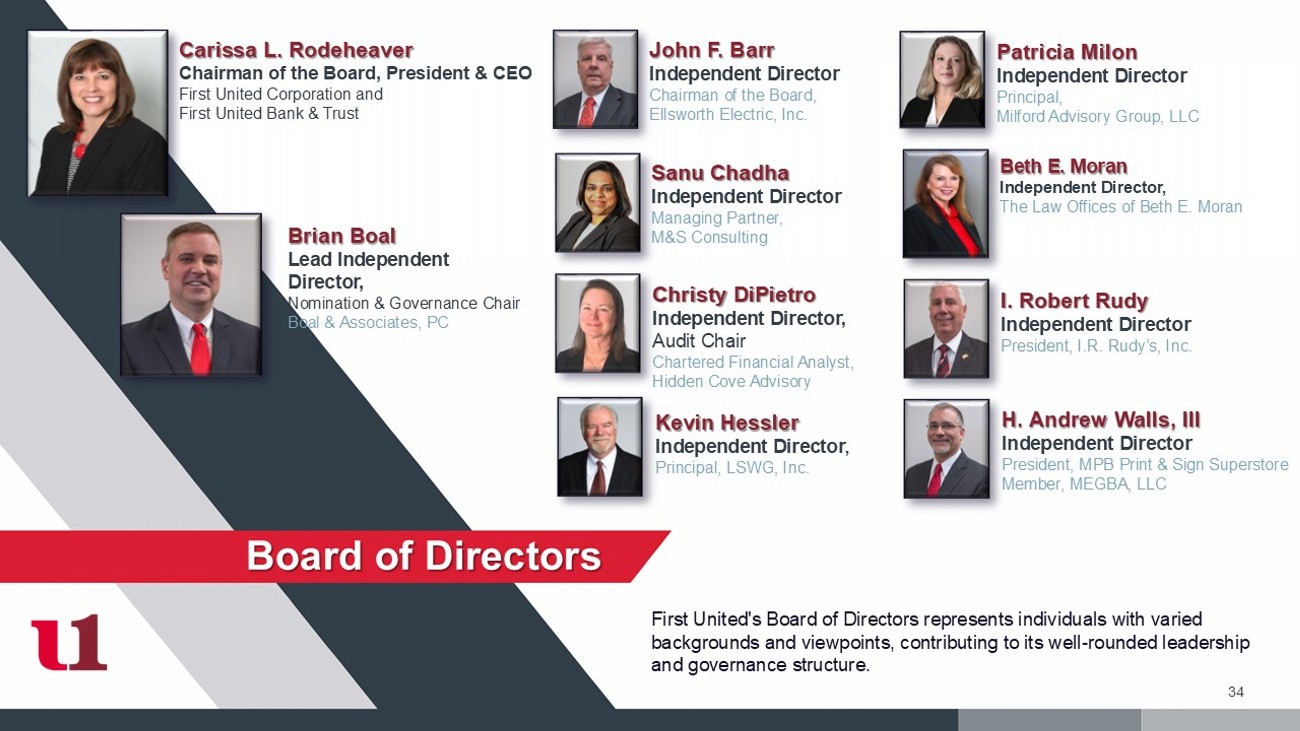 343434 John F. Barr独立董事Ellsworth Electric,Inc.董事长Sanu Chadha独立董事董事总经理合伙人、M & S Consulting Christy DiPietro独立董事、审计主席特许金融分析师、Hidden Cove Advisory Patricia Milon独立董事Principal、Milford Advisory Group,LLC TERM0独立董事总裁、I.R. Rudy’s,Inc. III H. Andrew Walls, III独立董事总裁、MEBA,LLC MPB Print & Sign Superstore成员Beth E. Moran独立董事、Beth E. Moran律师事务所Brian Boal首席独立董事、提名与治理主席Boal & Associates,PC Carissa L. Rodeheaver董事会主席、总裁兼首席执行官First United Corporation和马里兰第一联合 Bank & Trust董事会成员Kevin Hessler LSWG,Inc.独立董事、负责人马里兰第一联合的董事会代表具有不同背景和观点的个人,为其完善的领导层和治理结构做出了贡献。