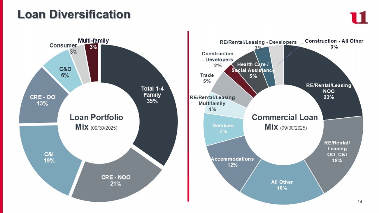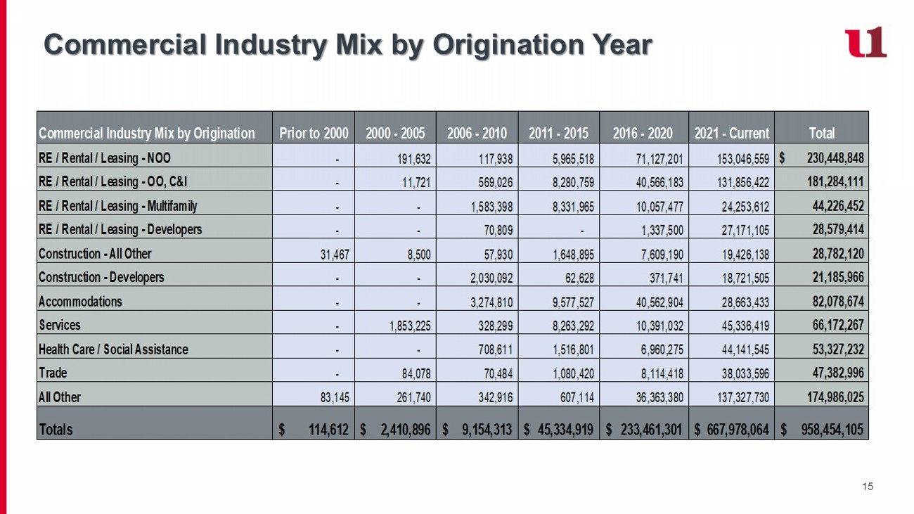 14合计1-4个家庭35% CRE-NOO 21% C & I 19% CRE-OO 13%建发6%消费者3%多家庭3%贷款多样化贷款组合组合(09/30/2025)REE/rental/leasing NOO 23% REE/rental/leasing OO,C & I 18%所有其他18%住宿12%服务7% REE/rental/leasing multifamily 4% trade 5% construction-developers 2% health care/social assistance 5% REE/rental/leasing-developers 3% construction-all other 3% commercial loan mix(09/30/2025)