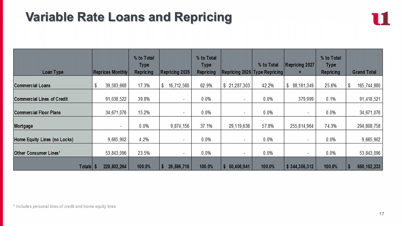 17浮动利率贷款和重新定价*包括个人信贷额度和房屋净值额度贷款类型每月重订%到总类型重定价重定价2025%到总类型重定价重定价2026%到总类型重定价重定价2027 + %到总类型重定价重定价大商业贷款总额39,583,668 $ 17.3% 16,712,560 $ 62.9% 21,287,303 $ 42.2% 88,161,349 $ 25.6% 165,744,880 $商业信贷额度91,038,52239.8-0.0%-0.0% 379,9999.1% 91,418,521商业平面图34,671,07615.2%-0.0%-0.0% 34,671,076抵押贷款-0.0% 9,874,15637.1% 29,119,63857.8% 255,814,96474.3% 294,808,758房屋净值额度(无锁)9*53,843,09623.5%-0.0%-0.0%-0.0% 53,843,096合计228,802,264 $ 100.0% 26,586,716 $ 100.0% 50,406,941 $ 100.0% 344,356,312 $ 100.0% 650,152,233 $